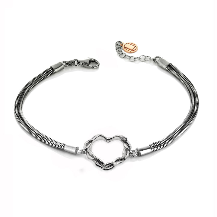 The BeLove Sterling Silver Bracelet is a unique and romantic expression of love. Handcrafted in Italy, this bracelet from the Heart collection features an elegant design of small, intertwined leaves that form a heart. Made from brunished sterling silver with 14k rose gold plated monograms, it has a timeless look with a modern twist. The double snake knit thread adds a sophisticated touch, making it a true symbol of Italian refinement.