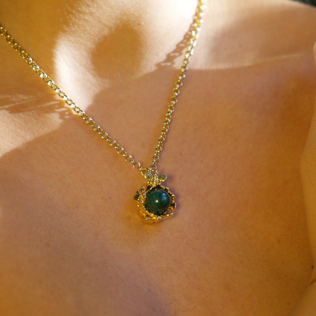The Natural Queen Necklace is a stunning piece that embodies the delicate strength of nature. Handcrafted in Italy, this necklace features a beautiful natural malachite stone, a gem known for its distinctive green layers and its association with transformation and prosperity. The intricate details of the wings and the opulent 18K gold plating over sterling silver give it a luxurious and elegant feel, making it a perfect statement piece.