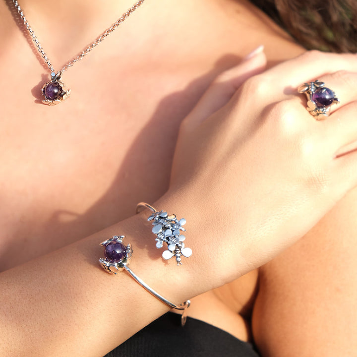The Natural Queen Necklace is a beautiful piece that honors nature and Italian craftsmanship. Handcrafted in Italy from antiqued sterling silver, this necklace features a natural amethyst stone, a gem known for its enchanting purple hue and symbolism of serenity, inner peace, and spiritual growth. The oxidized finish adds a touch of authenticity and brilliance, making it a timeless and elegant accessory for any occasion.