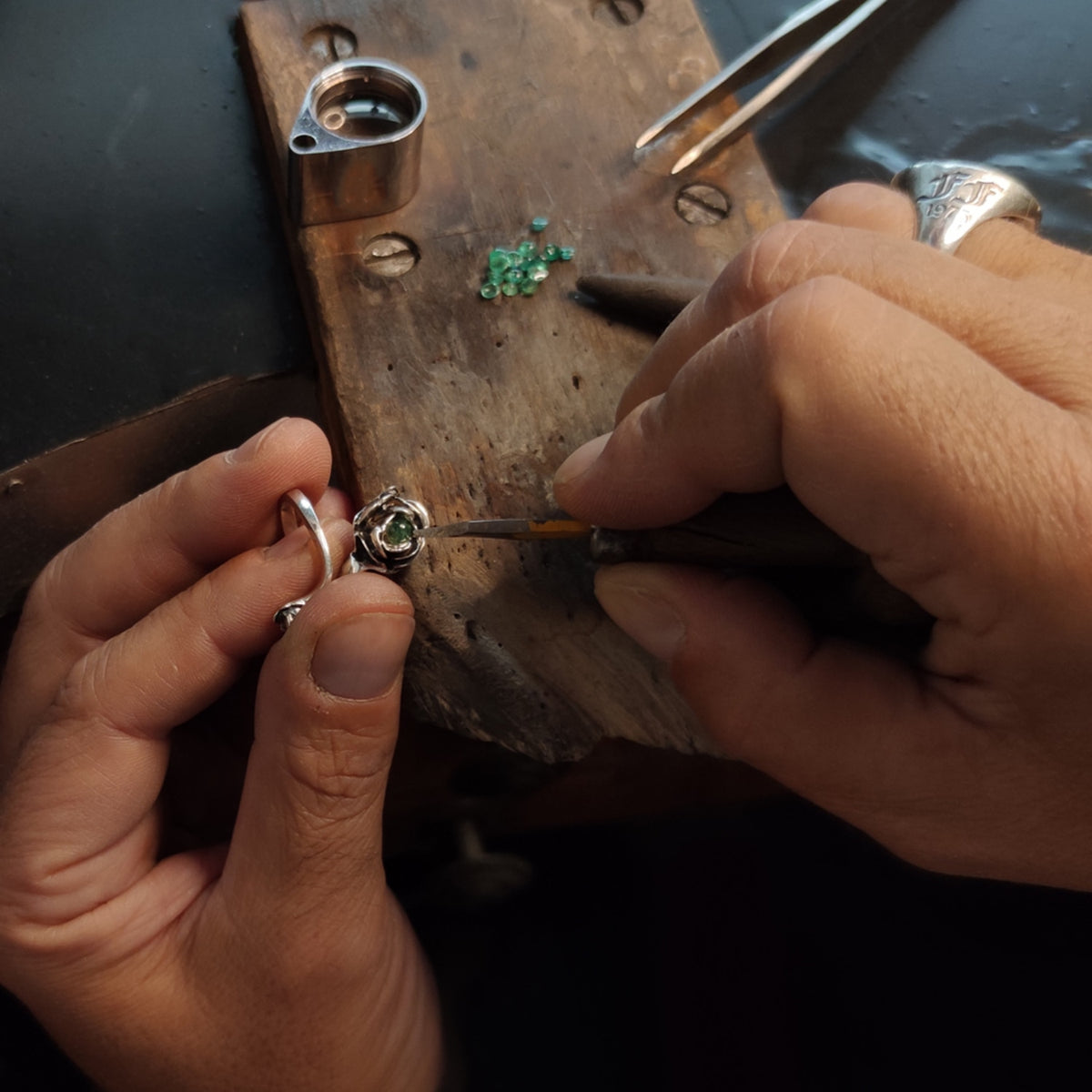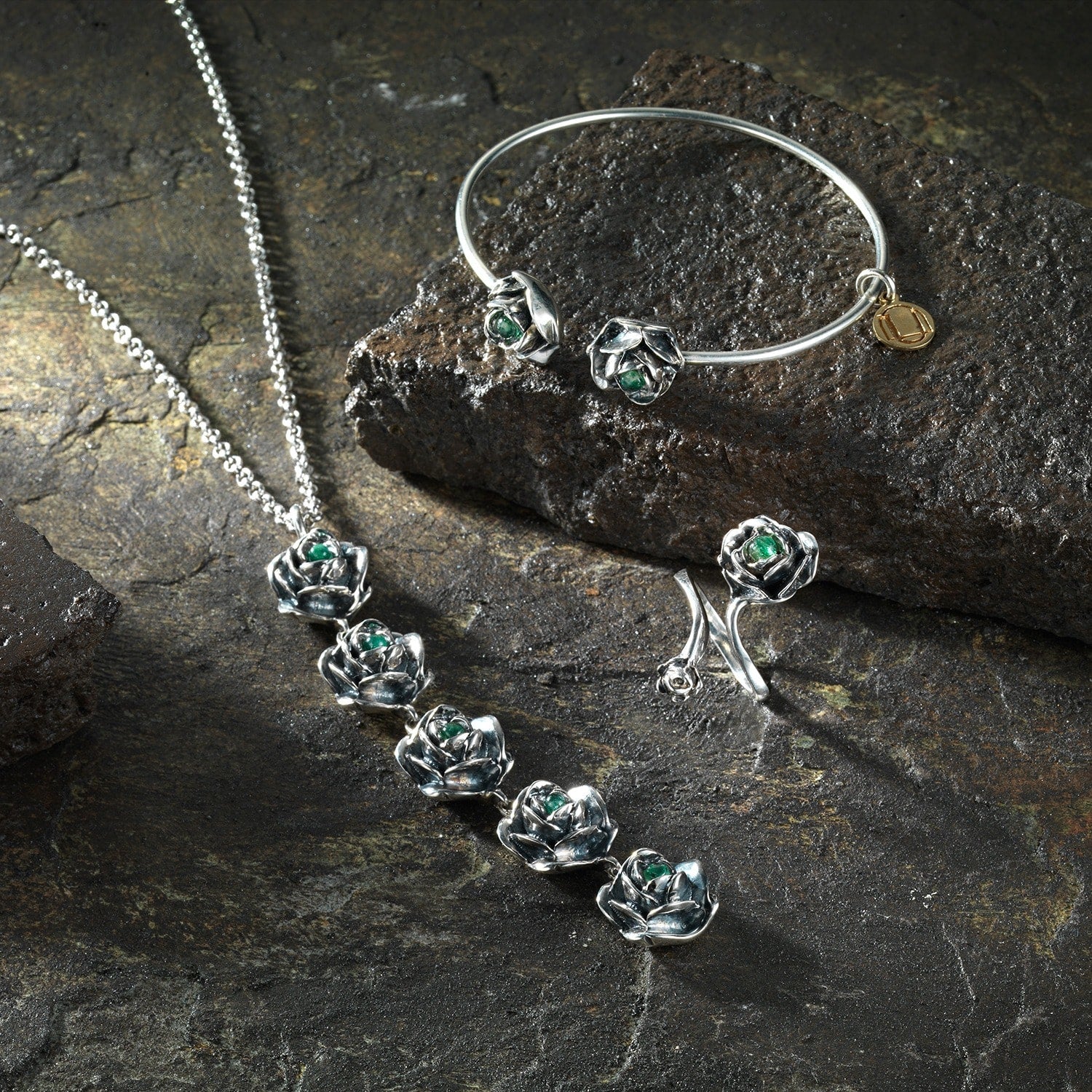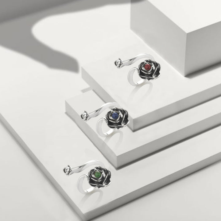 Rose Ring With Natural Emerald– Adjustable Sterling Silver Flower Jewelry