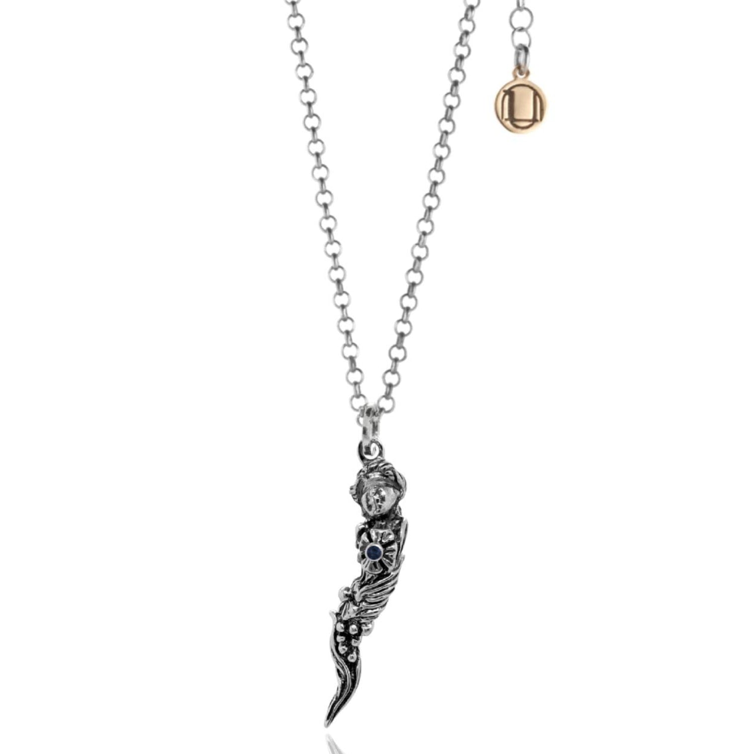 The Sterling Silver Necklace With Goddess Of Fortune With Natural Emerald is a beautiful and symbolic piece that blends ancient mythology with a modern aesthetic. Handcrafted in Italy from 925 sterling silver, it features the majestic Goddess of Fortune with a blindfold, representing blind luck. The goddess's horn is adorned with a natural emerald, a gem symbolizing wisdom, eloquence, and the rebirth of nature. This necklace is a unique and meaningful accessory.