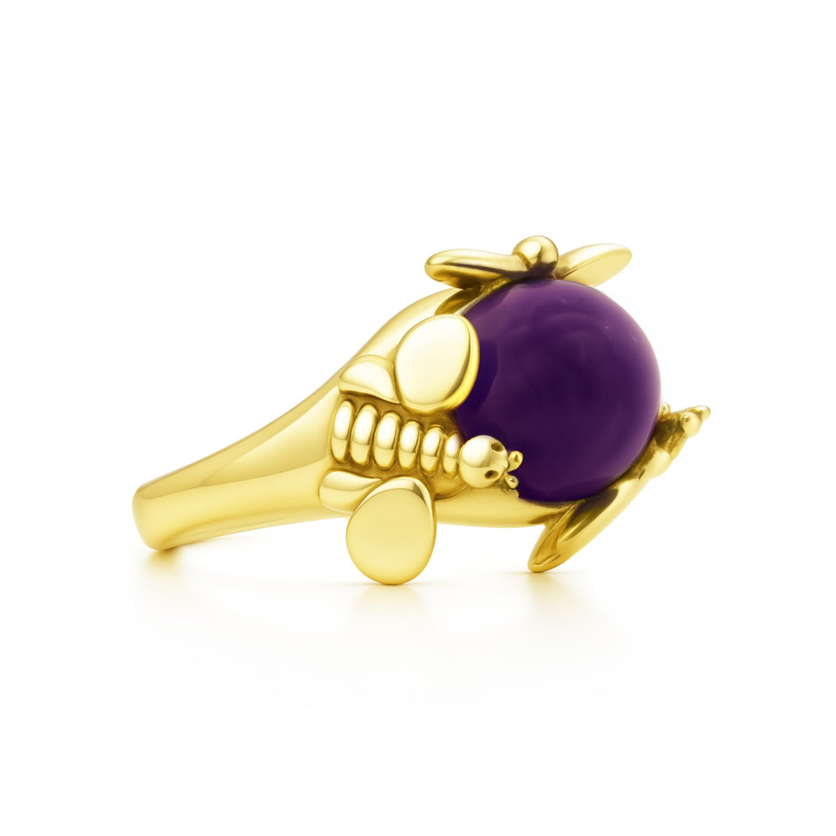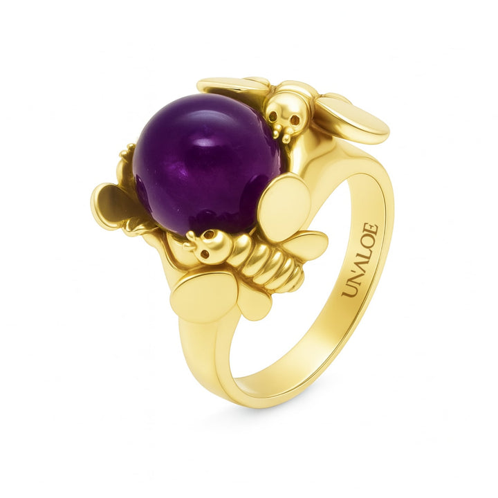 The Natural Queen Ring is an elegant piece that embodies the powerful royalty of a beehive. Handcrafted in Italy from gold-plated sterling silver, this ring features a beautiful natural amethyst stone, a gem that symbolizes inner peace and spiritual growth. Its intricate design, inspired by the harmony of a beehive, makes it a unique and meaningful statement piece.