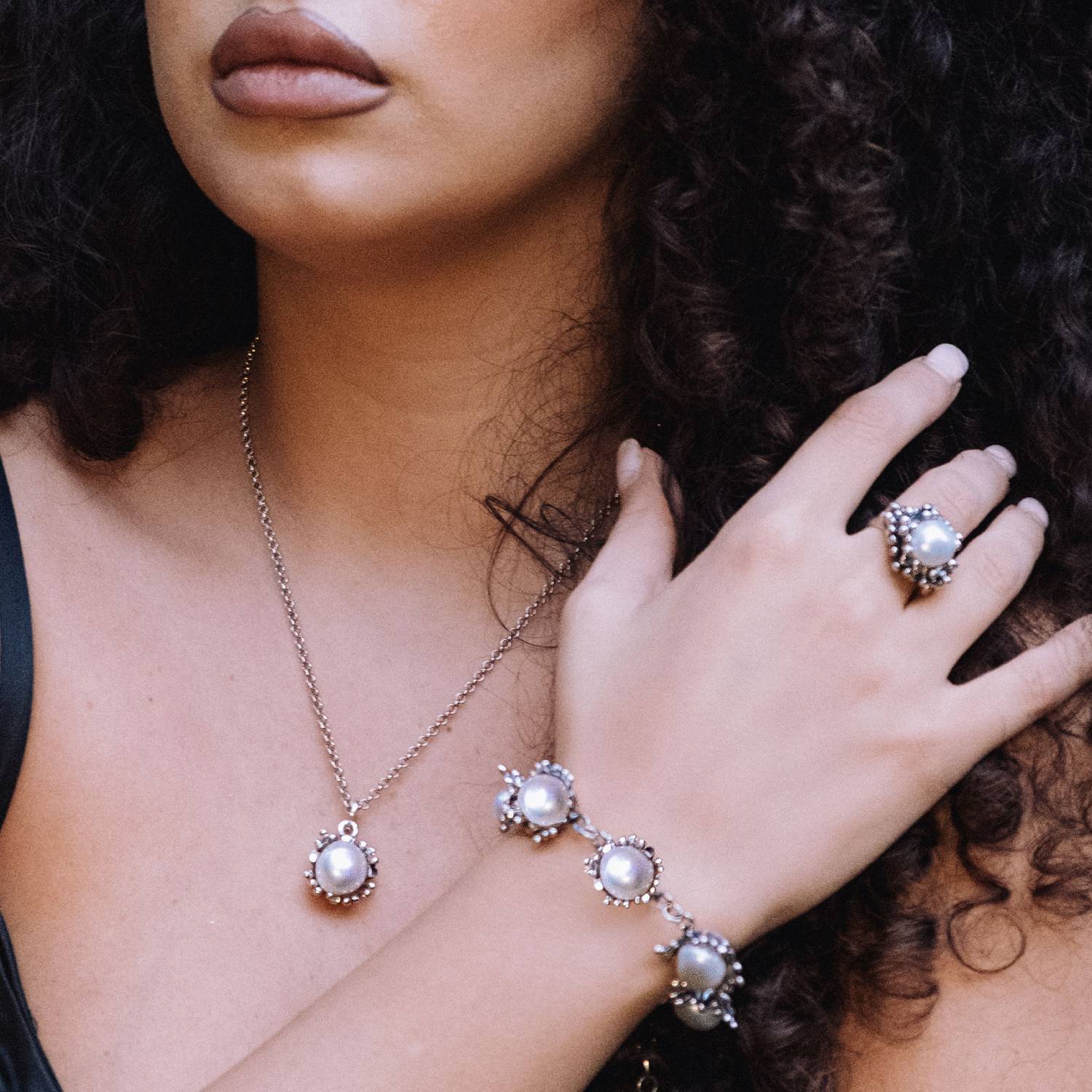 The Ribes Necklace is a charming pendant necklace that beautifully symbolizes the fabric of life. Handcrafted in Italy from sterling silver, its design features delicate beads that represent the cherished moments of our journey. At the heart of the necklace is a captivating natural white pearl. The pearl, known for its unique luster, is a symbol of hope and resilience, representing how beauty can emerge from life's challenges.