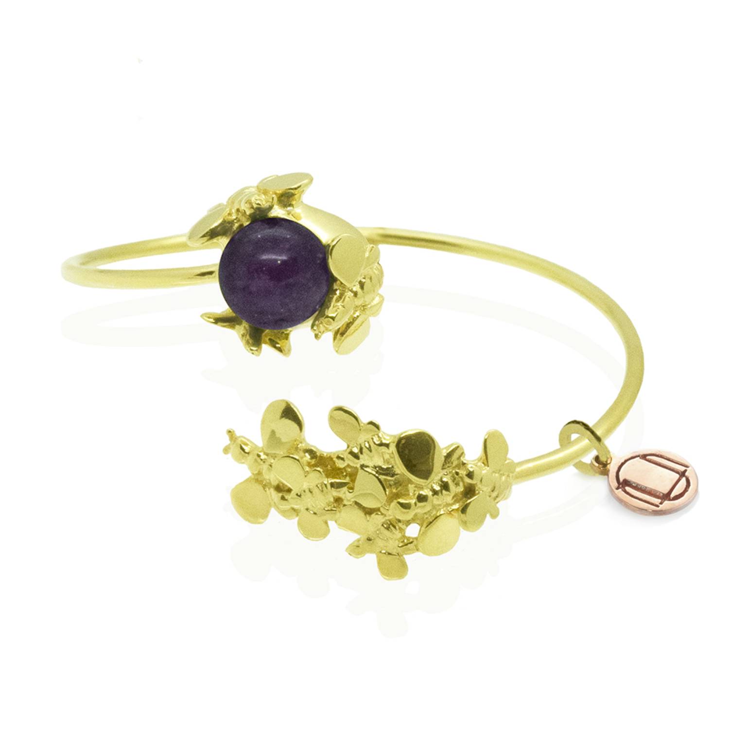 Handcrafted in Italy from 925 sterling silver with an 18k gold-plated finish (1 micron thick). It is adorned with a central natural amethyst and a 14k rose gold-plated monogram. This bracelet is nickel-free.