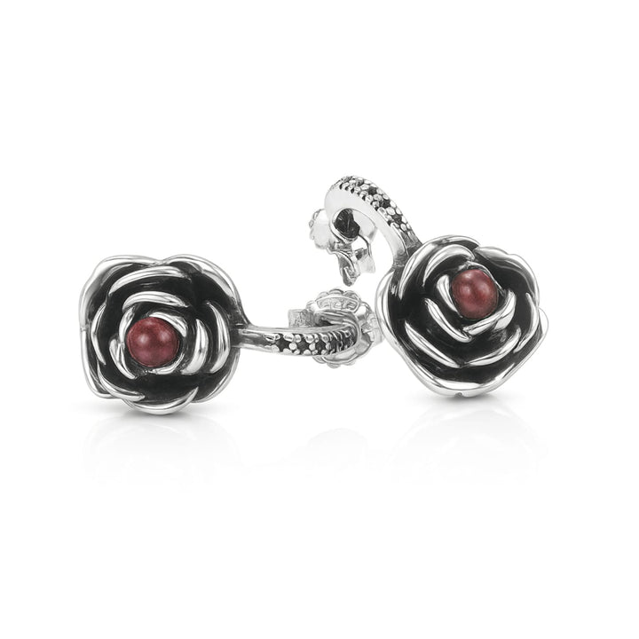 The Blackstar Rose Drop Earrings are a classic and exciting pair of birthstone earrings. Handcrafted in Italy from burnished 925 sterling silver, they feature a striking damask rose design with a central natural ruby, a gem known as a symbol of passionate love and rarity. The earrings have a classic drop silhouette and are accented with darkened diamond backings. These earrings are a beautiful and unique expression of authentic Italian craftsmanship.
