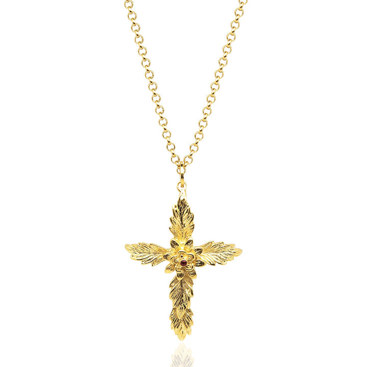 The Cross Amen Necklace is a timeless piece that blends spiritual symbolism with sophisticated design. Handcrafted in Italy from gold-plated sterling silver, this pendant necklace features a cross design with a central Unaloe rose that holds a radiant natural ruby. Known as a symbol of passionate love, the ruby is one of the most precious and rare natural stones. This necklace is a beautiful testament to authentic Italian craftsmanship.