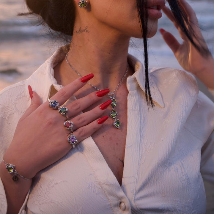 The Coleus Bracelet is an elegant piece that is both charming and versatile. Made from 925 sterling silver, this bracelet features a delicate adjustable snake link chain. At the center is a precious green cubic zirconia stone, a symbol of vitality, harmony, and respect for nature. This piece is a beautiful representation of how experiences weave together to shape our lives, and the single, radiant stone is its heart.