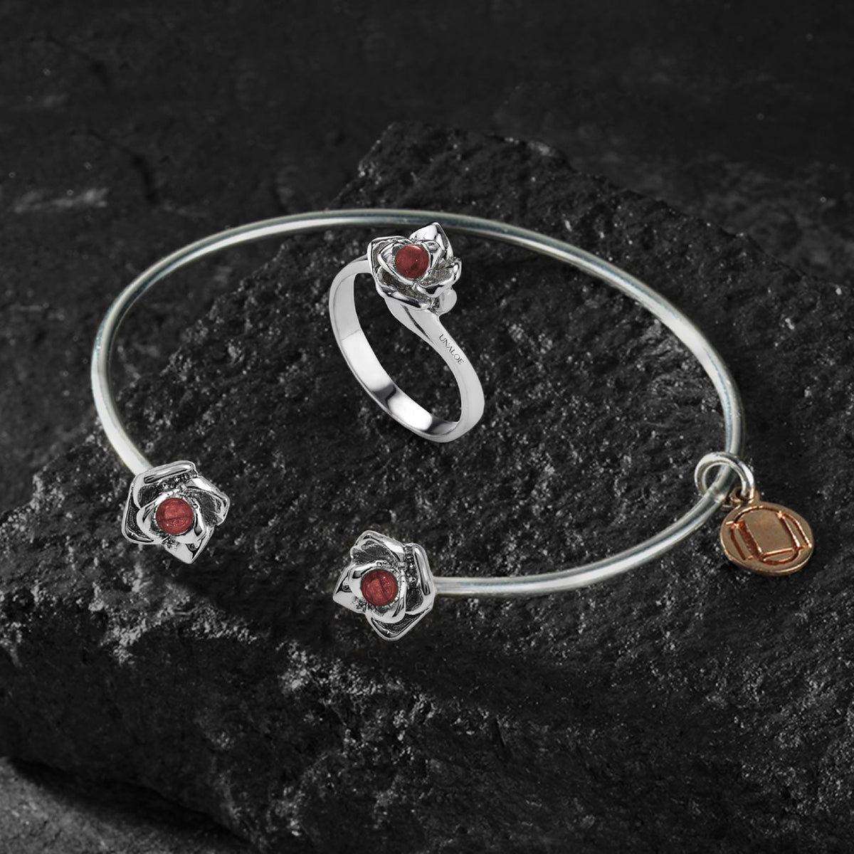 The Magnifica Bracelet is a captivating piece that celebrates nature's beauty and the artistry of Italian craftsmanship. Made from blackened 925 sterling silver, this bracelet features a unique design with a central natural ruby. Known as a symbol of passion and ardent love, the ruby is one of the most precious and rare natural stones. The bracelet also features a 14k rose gold-plated Unaloe monogram, adding a touch of luxury. This fine bracelet is an expression of individuality and a tribute to the timeless elegance of authentic Italian artistry.