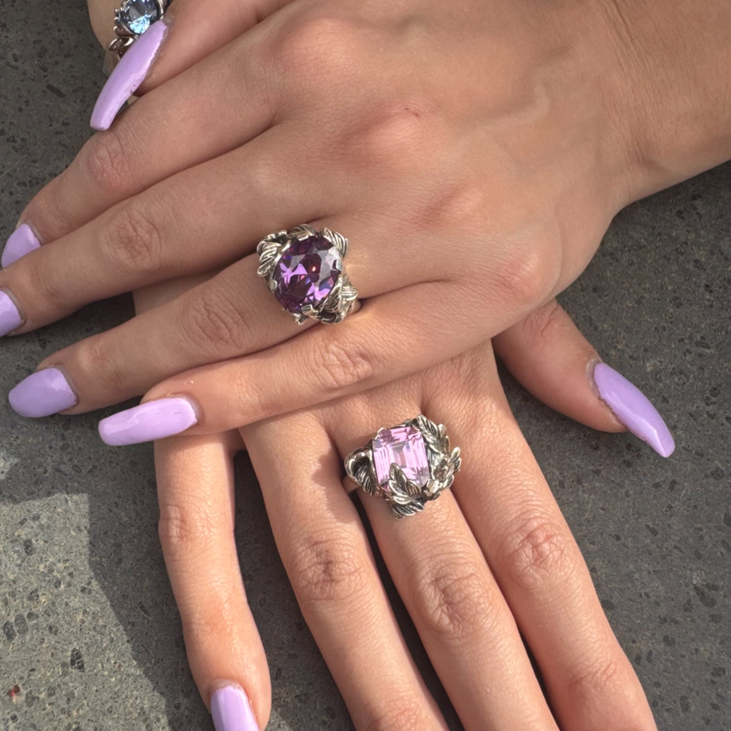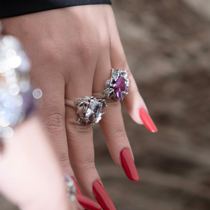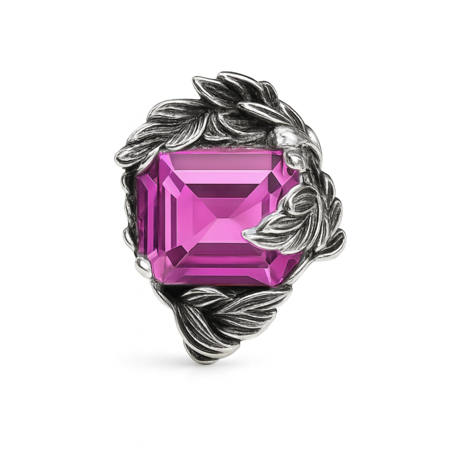 This Coleus Quadratus Ring by Unaloe is a unique work of art, with a chunky aesthetic that weaves a tangible narrative of life itself. The sterling silver band is adorned with intricate leaf details that seem to "dance" around a central square-cut pink cubic zirconia. This vibrant stone symbolizes love, beauty, and emotional healing, while the design represents the interwoven fragments that make up our personal story. Crafted with Italian artistry, this ring is a powerful and luxurious statement piece.