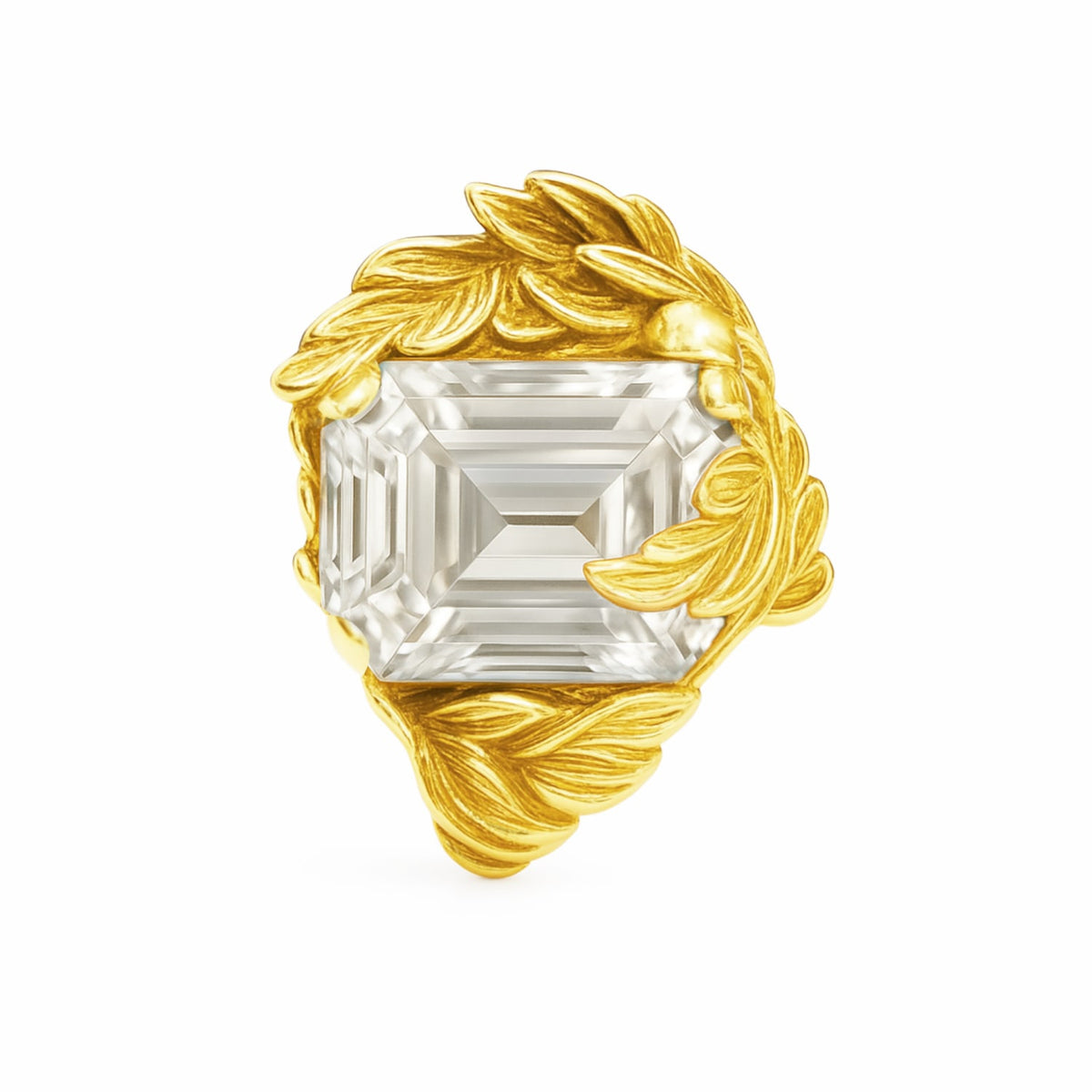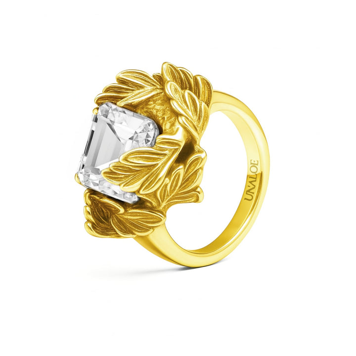 This Coleus Quadratus Ring by Unaloe is a unique work of art, with a chunky aesthetic that weaves a tangible narrative of life itself. The gold-plated sterling silver band is adorned with intricate leaf details that seem to "dance" around a central square-cut white cubic zirconia. This pure, bright stone symbolizes inner balance and personal transformation, while the design represents the interwoven fragments that make up our personal story. Crafted with Italian artistry, this ring is a powerful and luxurious statement piece.