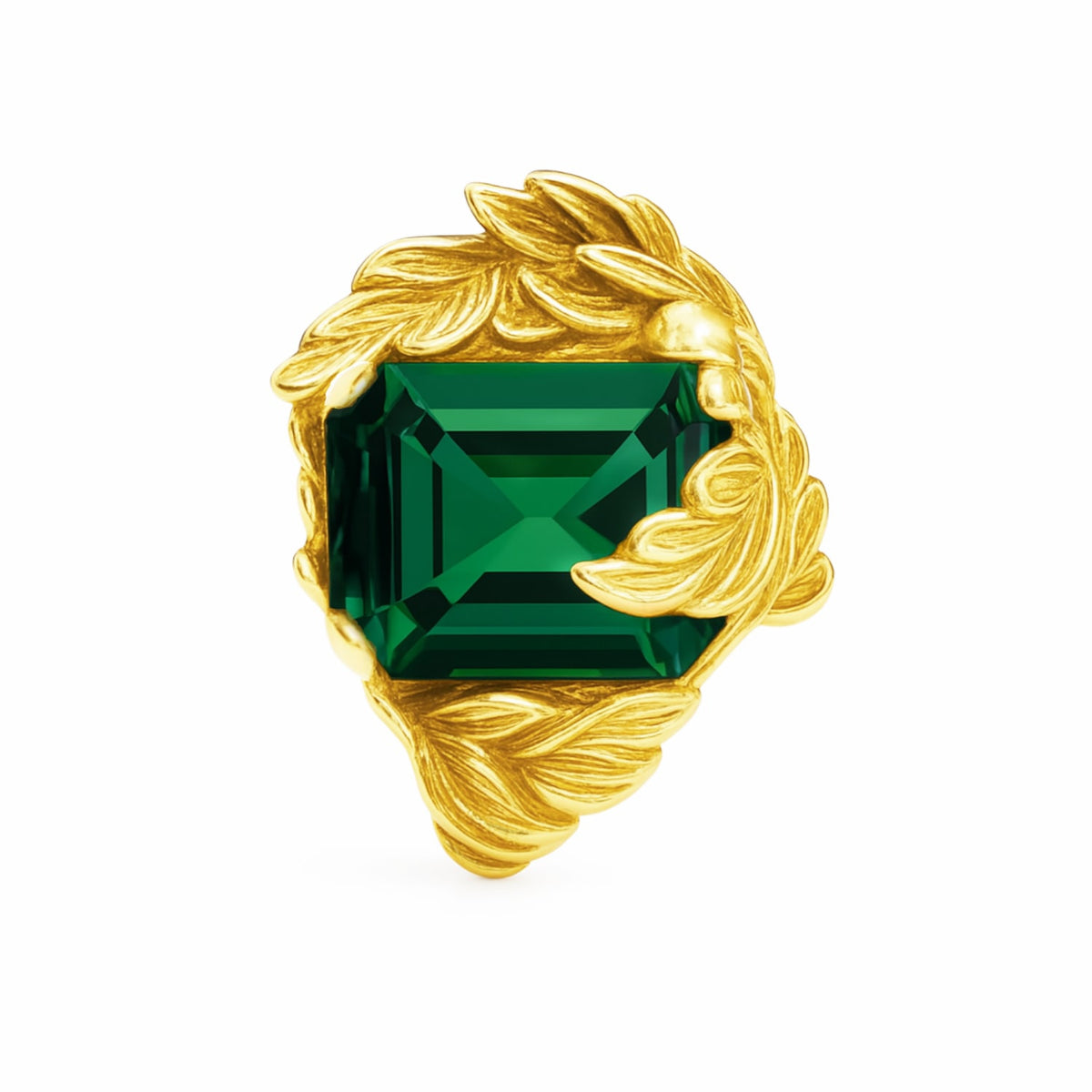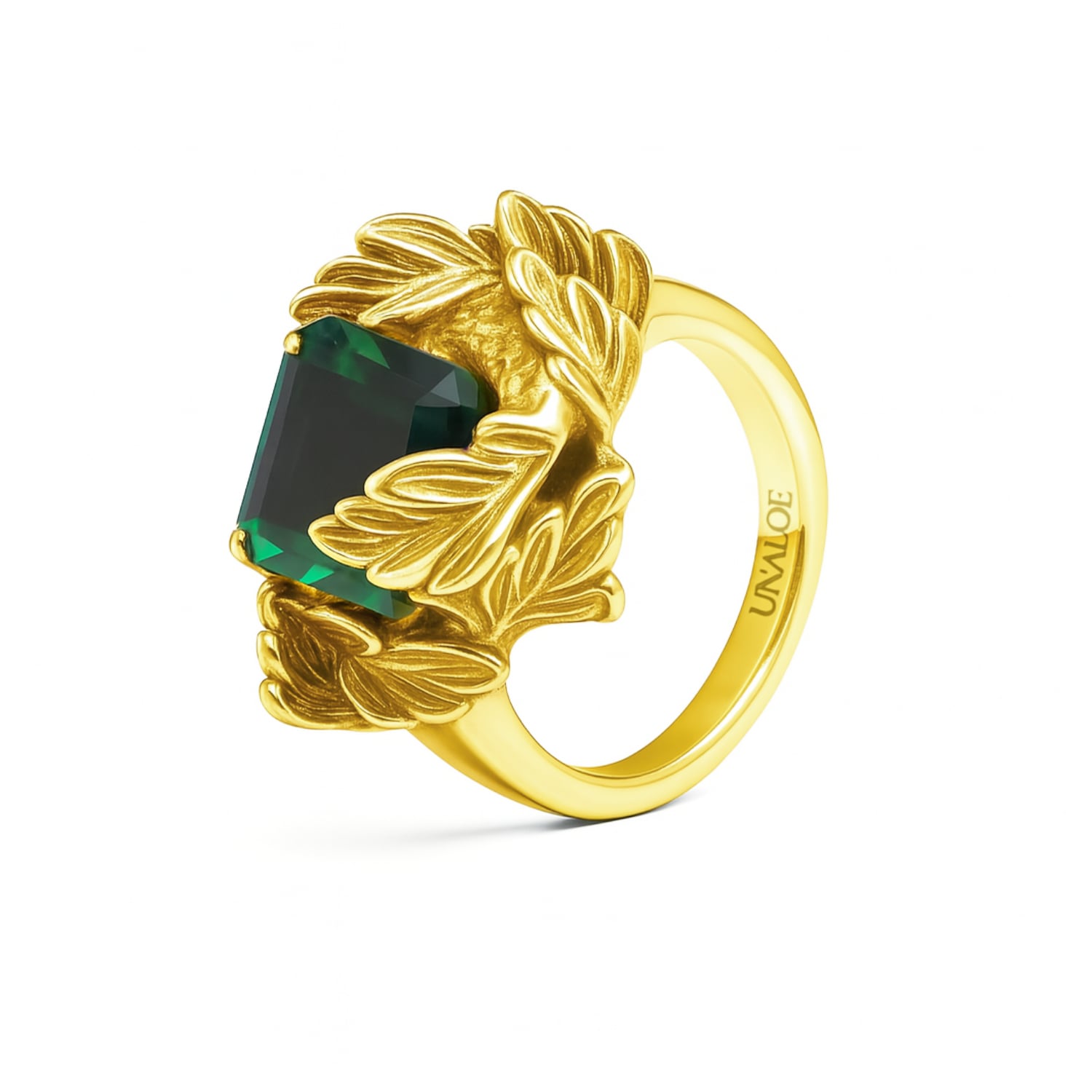 This Coleus Quadratus Ring by Unaloe is a unique work of art, with a chunky aesthetic that weaves a tangible narrative of life itself. The gold-plated sterling silver band is adorned with intricate leaf details that seem to "dance" around a central square-cut green cubic zirconia. This vibrant stone symbolizes vitality and respect for nature, while the design represents the interwoven fragments that make up our personal story. Crafted with Italian artistry, this ring is a powerful and luxurious statement piece.