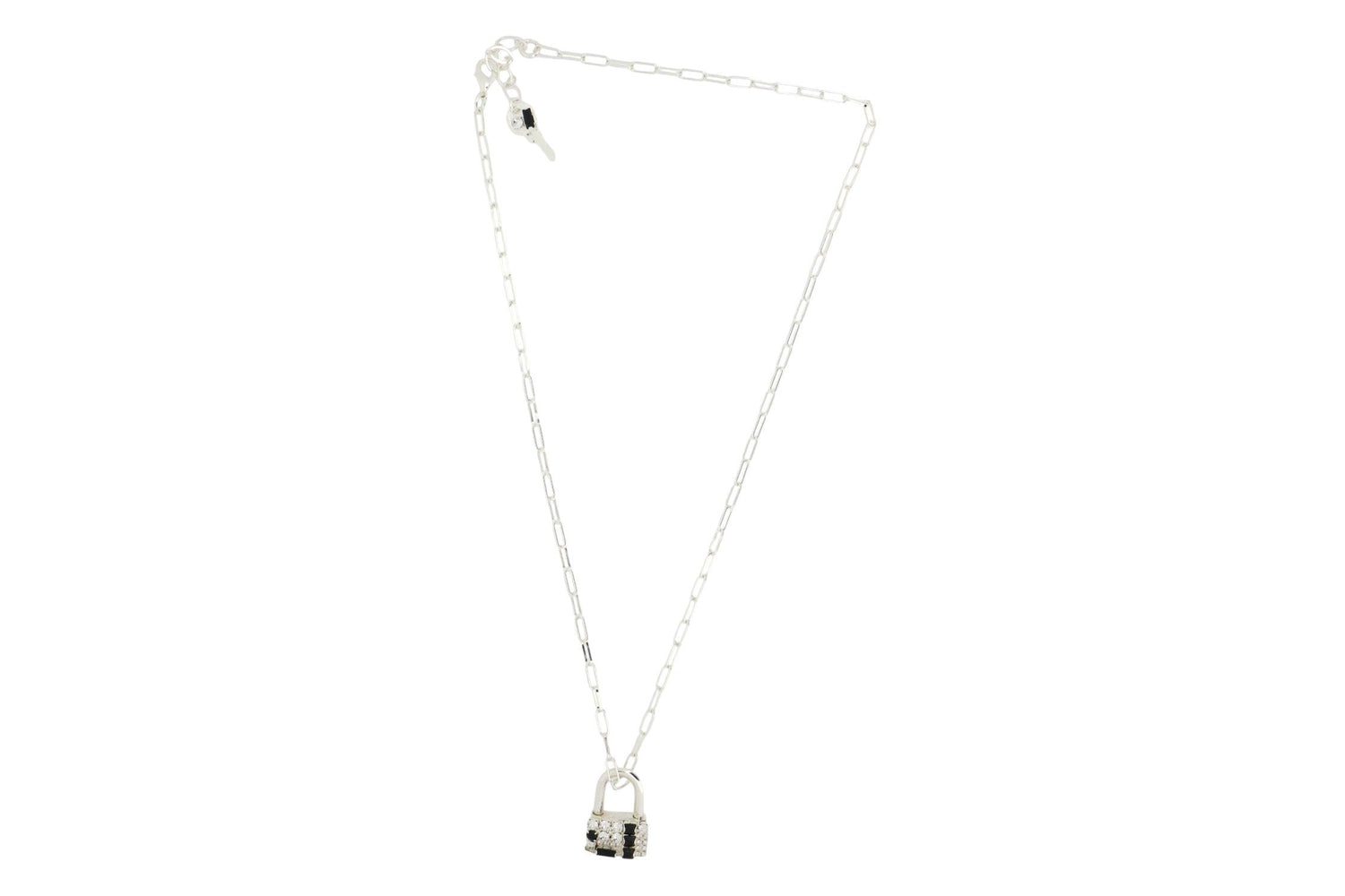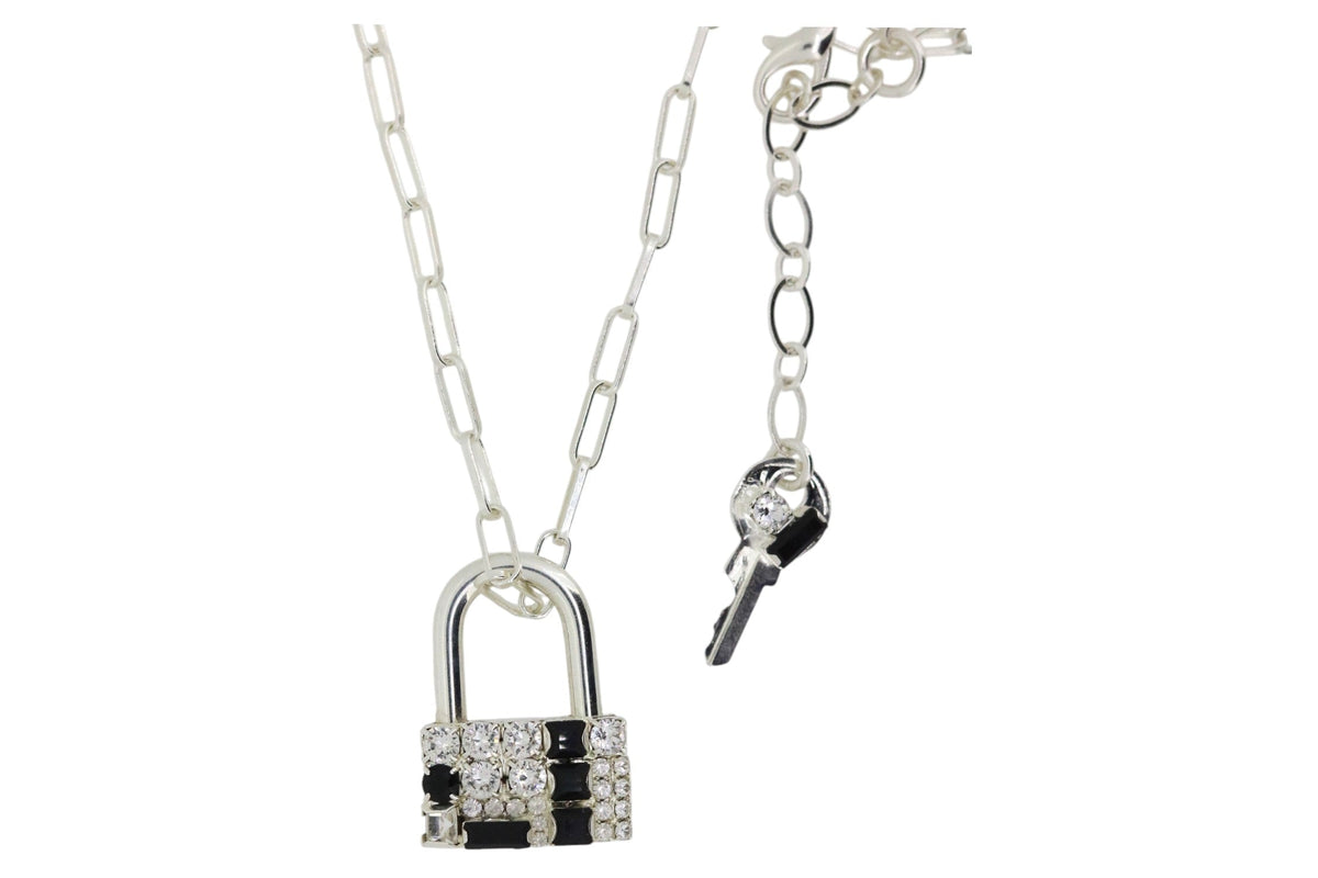 The Tweed Lock Necklace In Silver by Vickisarge is a stylish and modern accessory. It features a black and clear crystal-embellished lock that is Sterling Silver-plated and hangs from a minimalist paperclip chain. It’s a chic and delicate piece that adds a touch of sparkle to any outfit.