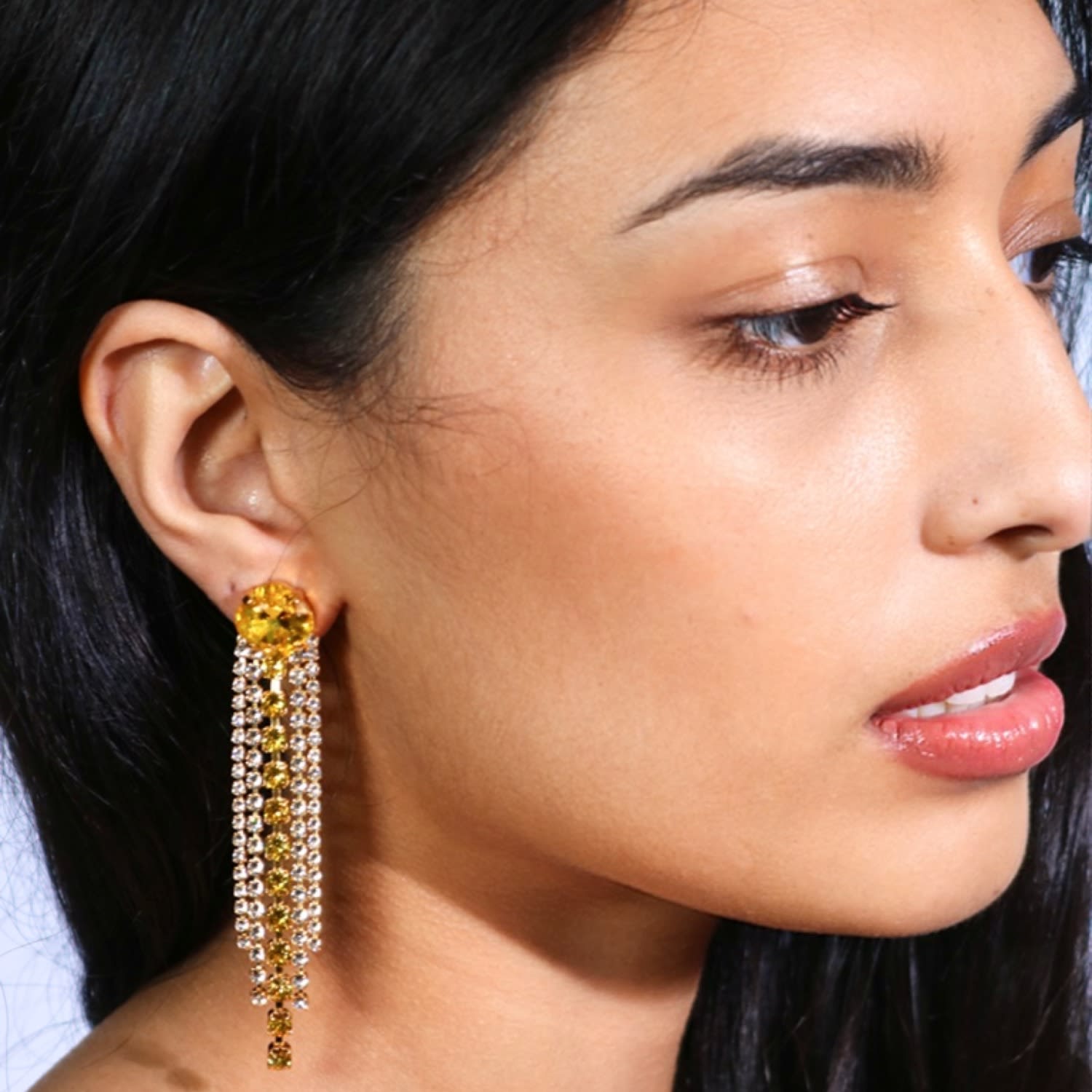 The Yellow Shooting Stars In Gold by Vickisarge are a pair of handcrafted dangle earrings that create a dazzling "iconic illumination." They feature brilliant cushion-cut premium Austrian crystals in a vibrant yellow, dripping with shimmering tails, set in 23k gold-plated brass. These earrings are designed to make a bold statement.