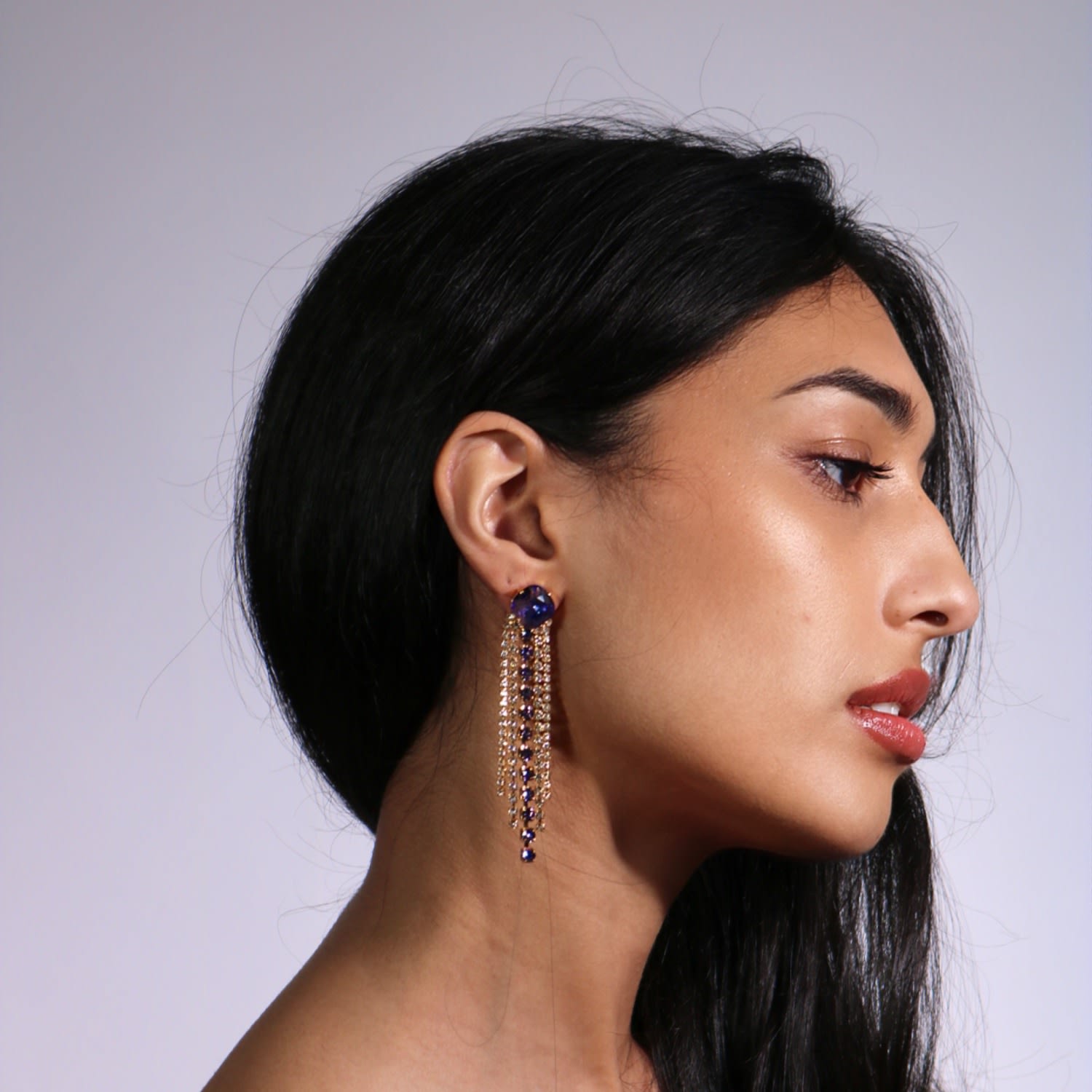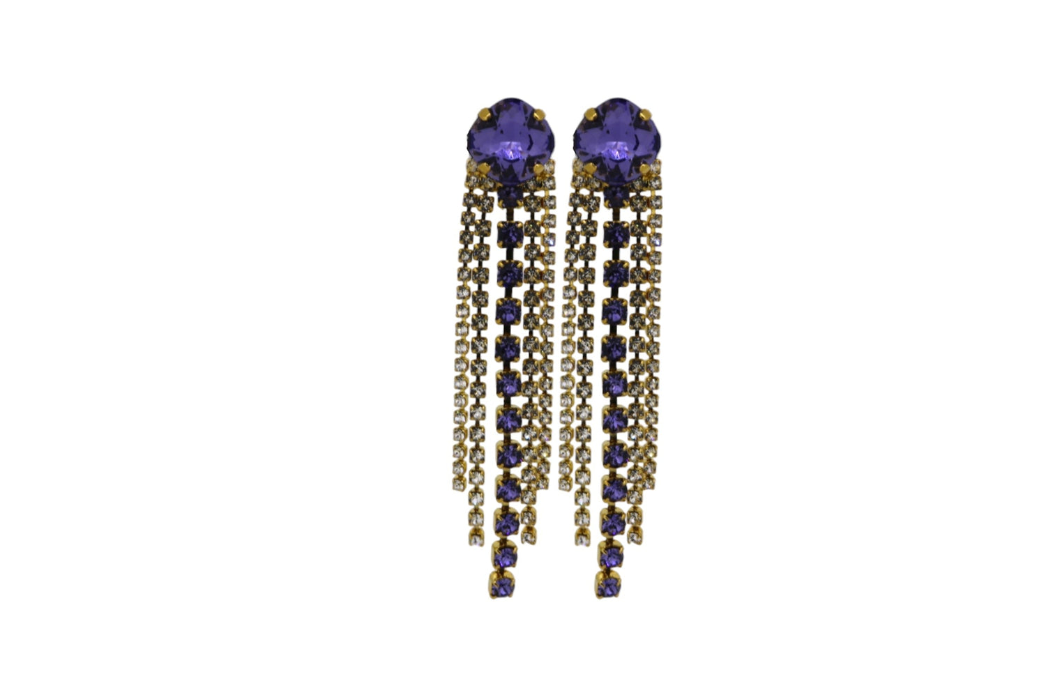 The Purple Shooting Stars In Gold by Vickisarge are handcrafted dangle earrings that "dare to dazzle." They feature brilliant cushion-cut premium Austrian crystals in a stunning purple, with shimmering tails, set in 23k gold-plated brass. This piece is unique and adds a touch of bold, elegant sparkle to any outfit.