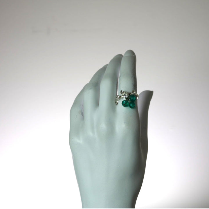This Indore Droplets Ring in Green by Vickisarge is a whimsical cocktail ring that brings playful movement and vibrant energy to the hand. Shimmering crystal droplets cascade delicately, supporting a tassel of pearl and emerald-green beads, evoking the lush charm of a garden after rain. Its adjustable band ensures a comfortable fit while enhancing its versatility. A one-of-a-kind creation, this ring embodies Vickisarge’s signature blend of boldness, artistry, and couture craftsmanship.