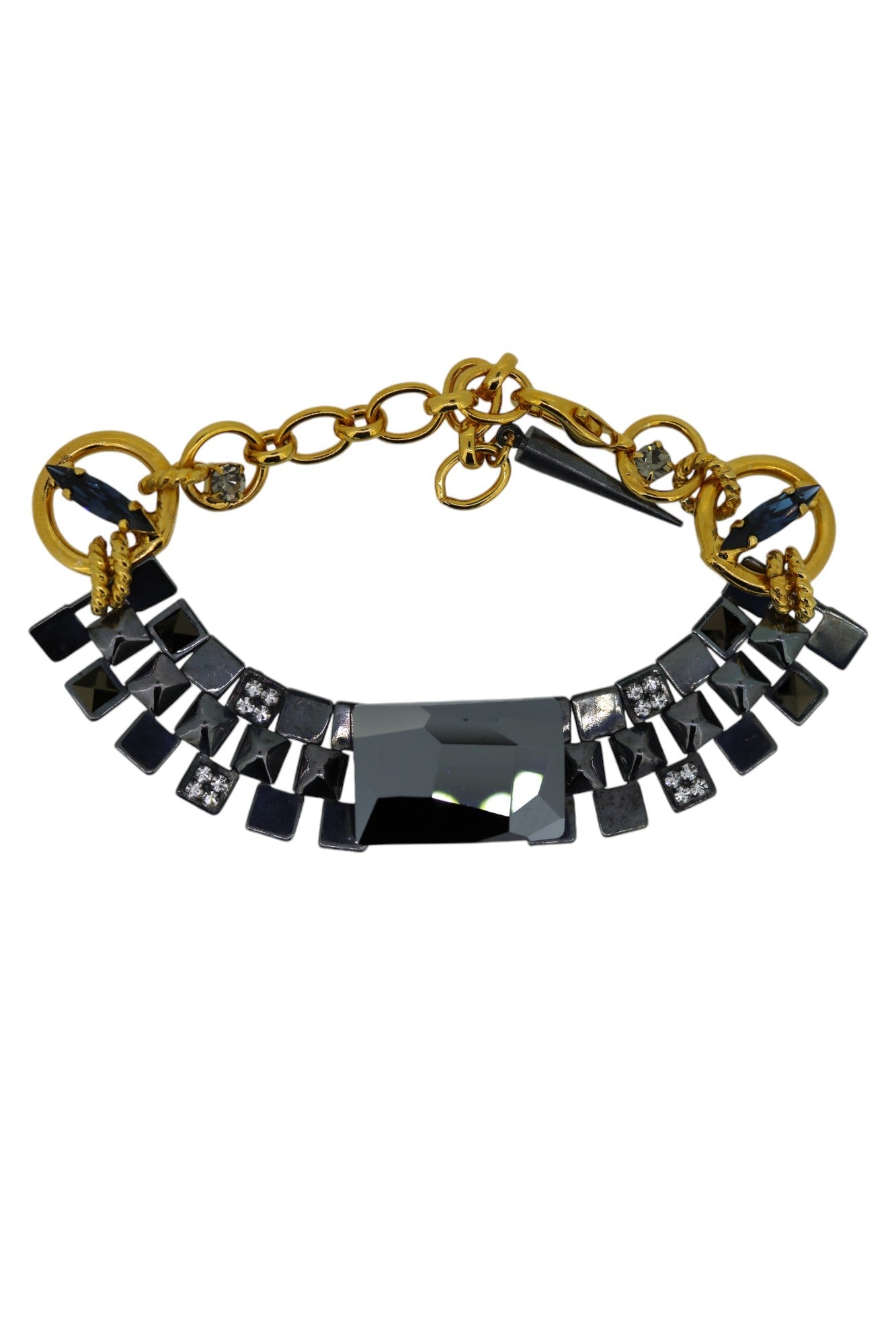 This chain bracelet is handcrafted from oxidized sterling silver-plated nickel-free brass, 23-karat gold-plated nickel-free brass, and premium black Austrian crystals.