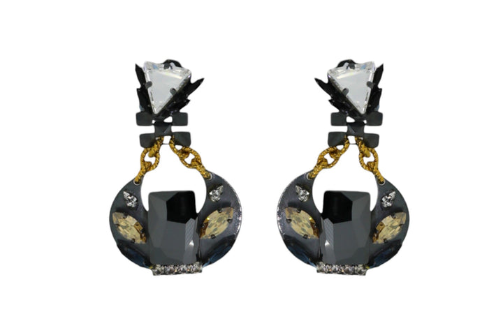 The Midnight Earrings by Vickisarge are a pair of impactful, one-of-a-kind chandelier earrings. They feature a forked flame motif finished in antiqued sterling silver, adorned with black, blue, and grey Austrian crystals. These articulated earrings catch the light as they move, creating a dramatic and elegant effect. They come with a certificate of authenticity.