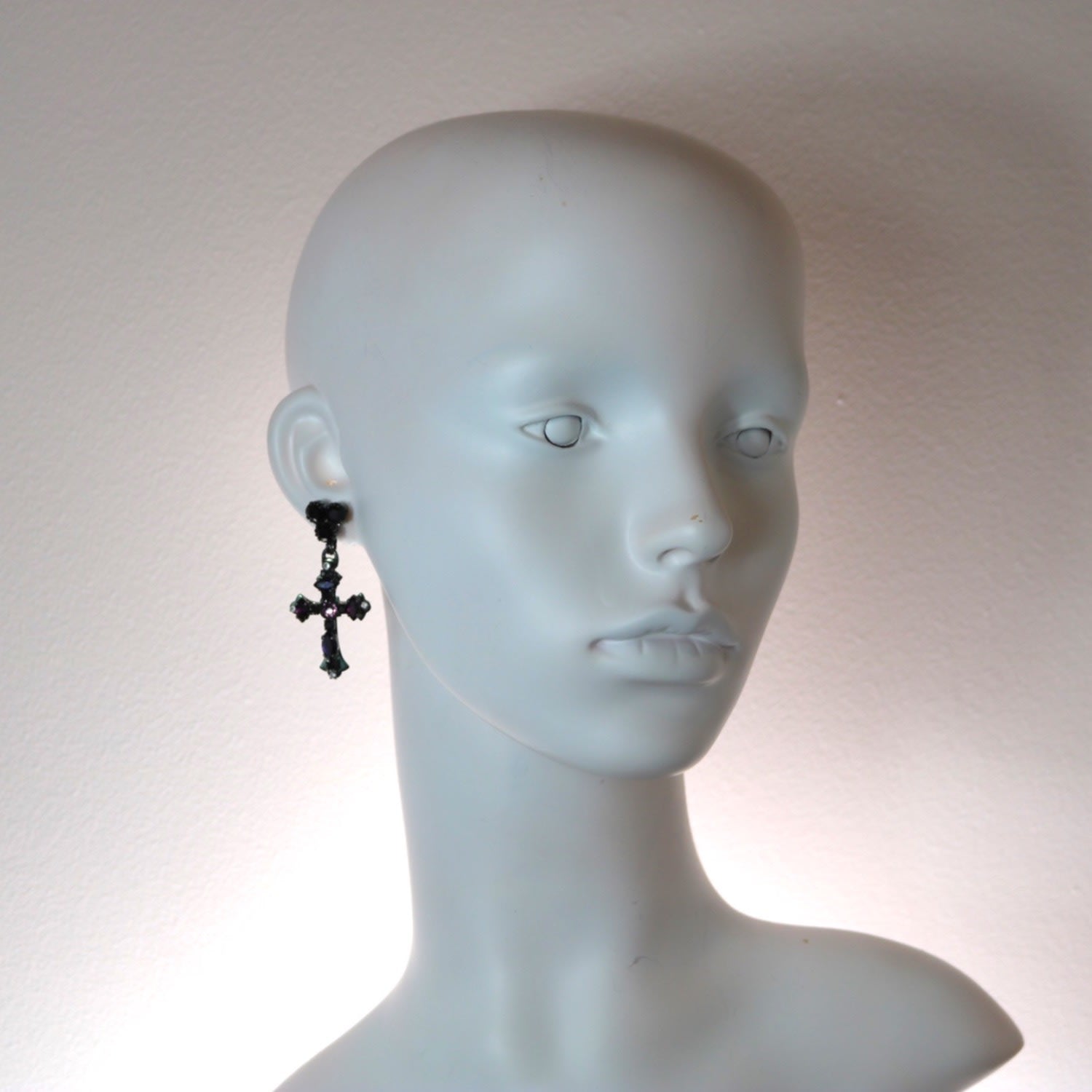 The Purple Cross Earrings In Oxidised Silver by Vickisarge are a unique, one-of-a-kind accessory. These earrings are plated in oxidized sterling silver and feature vintage materials and premium Austrian crystals. The design is both sparkly and edgy, perfect for adding a bold statement to a party outfit. They are handcrafted in the Kensington workshop.