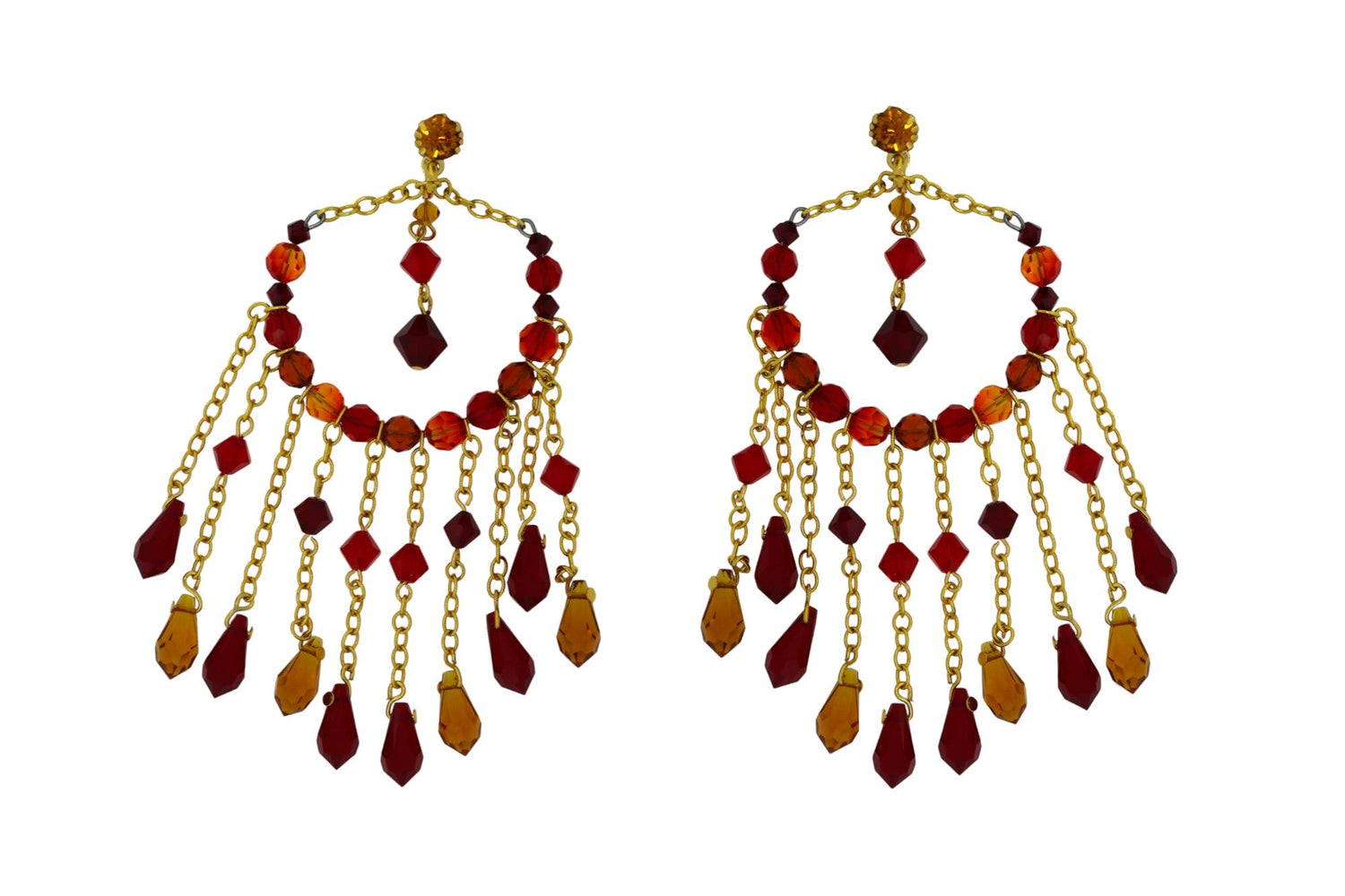 These chandelier earrings are made with 23-karat gold-plated, nickel-free brass and surgical steel posts. They are adorned with premium Austrian crystals in orange and red.