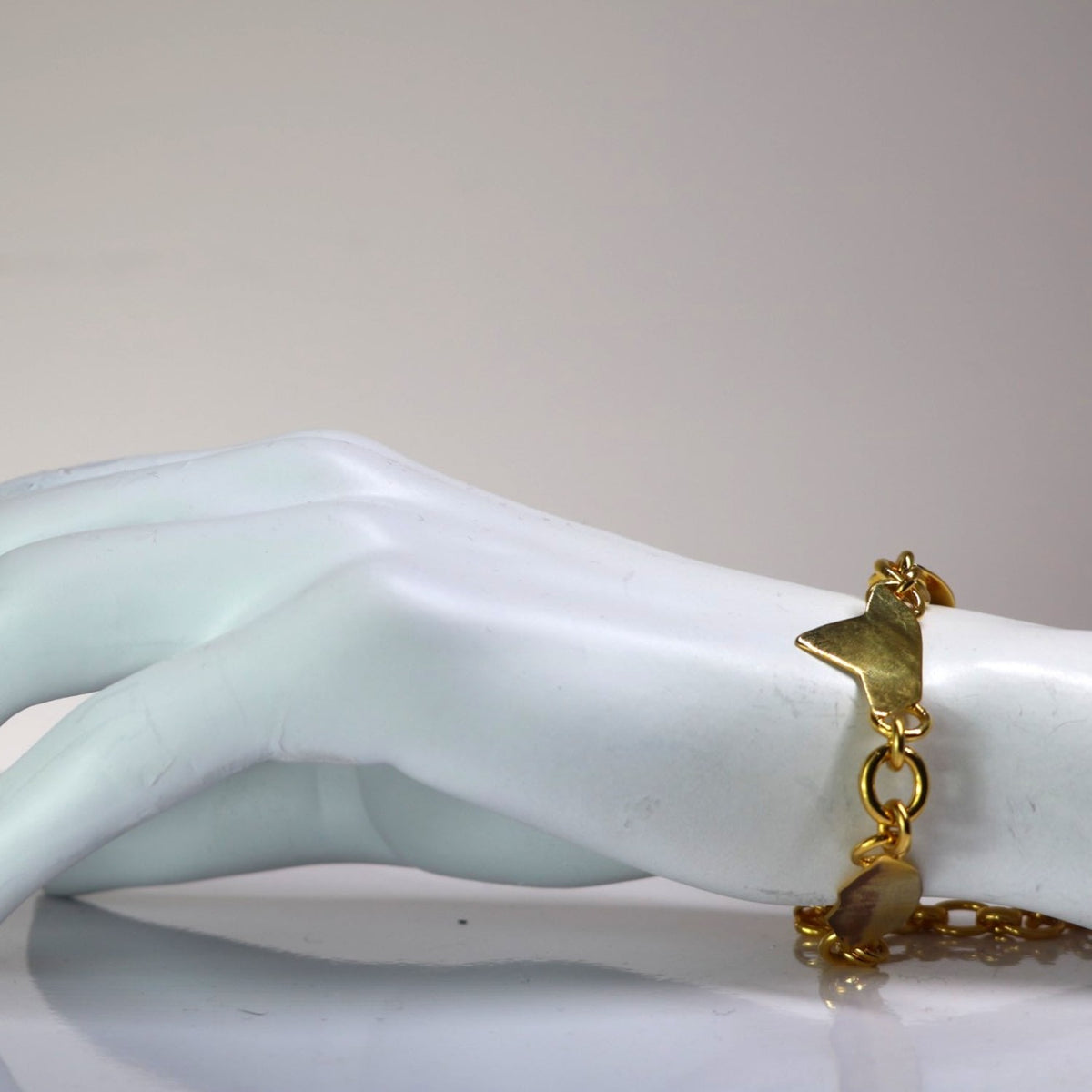 This charm bracelet is made from 23-karat gold-plated, nickel-free brass and copper. It features hand-cut charms in the shape of paper boats, smiles, hearts, and diamonds. It is a limited-edition piece.