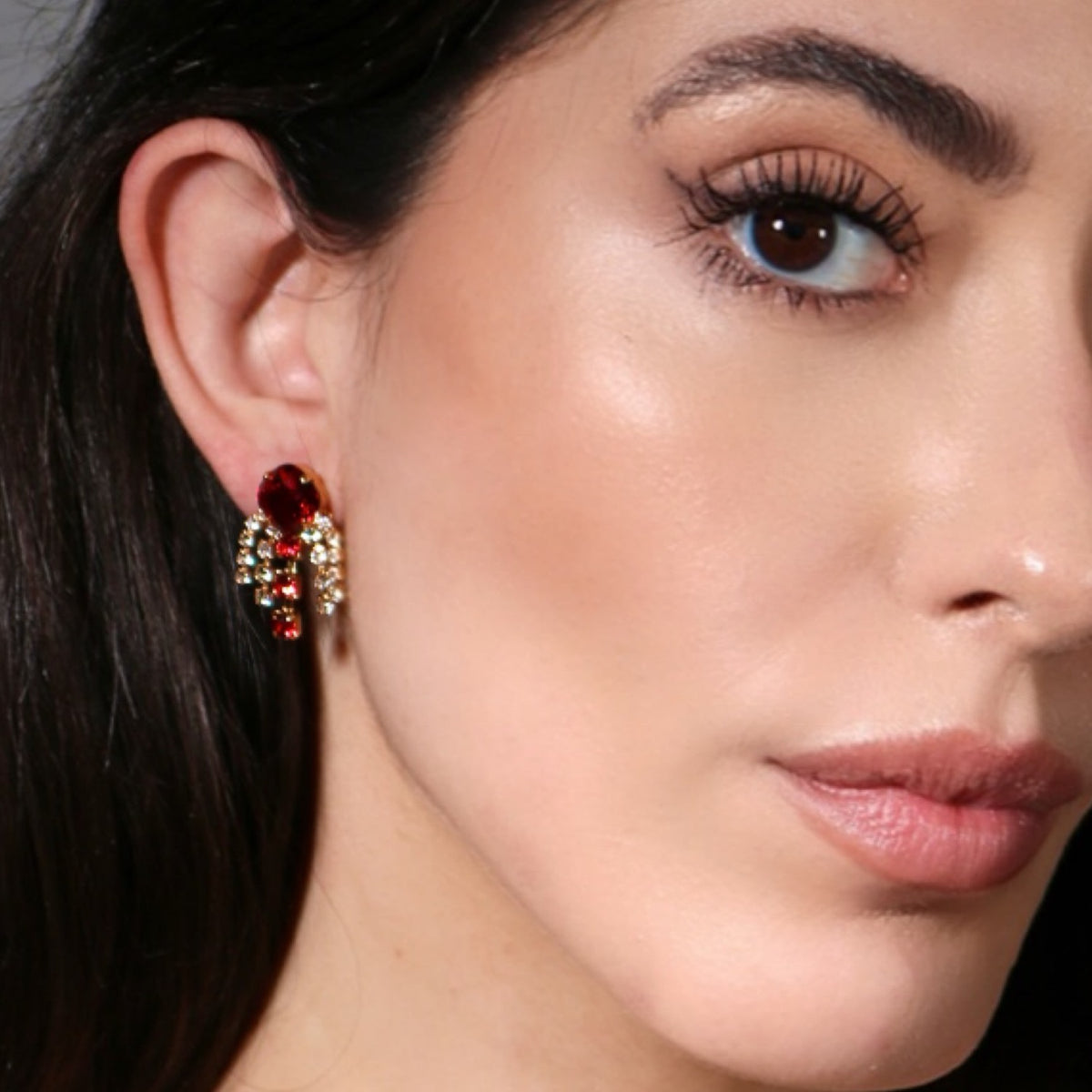 The Red Sparkler In Gold by Vickisarge are dazzling chandelier earrings. These earrings feature cushion-cut crystals with shimmering tails and a gold plating. They are handcrafted in a Kensington workshop and offer a brilliant, yet subtle, display of sparkle.
