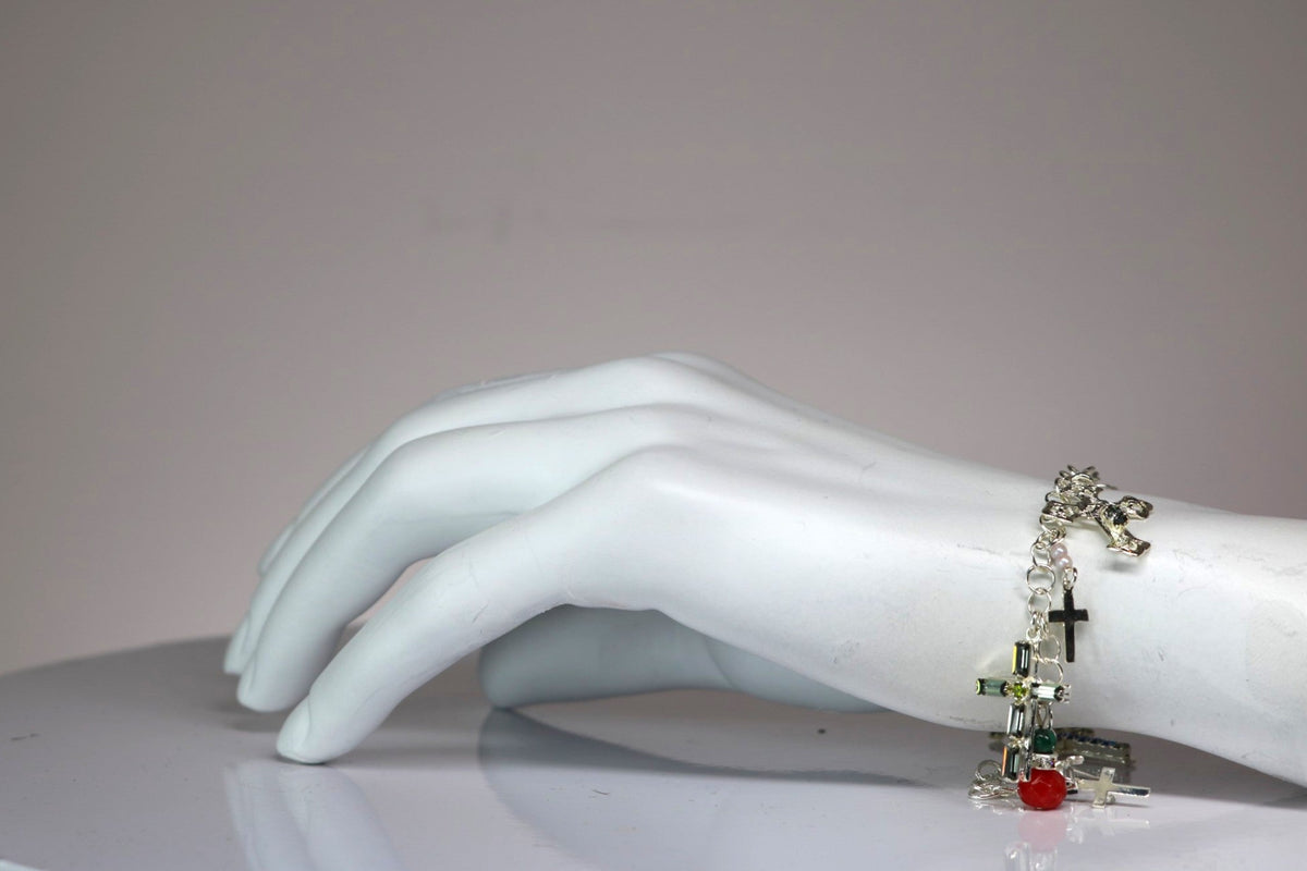 This charm bracelet is made with sterling silver-plated, nickel-free brass. It is adorned with premium Austrian crystals and minute pearls. It is a limited edition of four.