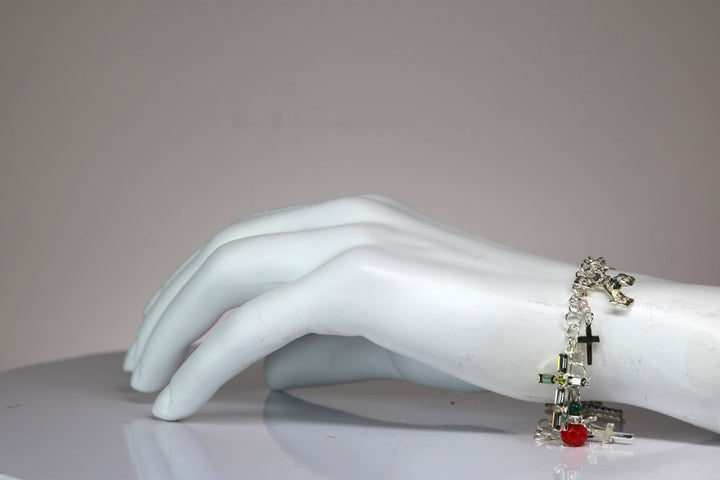 The Silver Sin Bracelet by Vickisarge is a chic, limited-edition charm bracelet. It is a silver-plated bracelet adorned with an array of delicate cross charms. The piece is accented with shimmering crystals and minute pearls, offering a refined, yet edgy touch. It is handmade in London and comes with a certificate of authenticity.