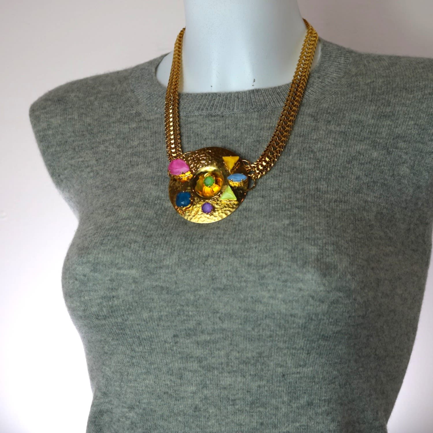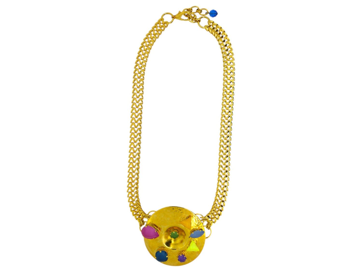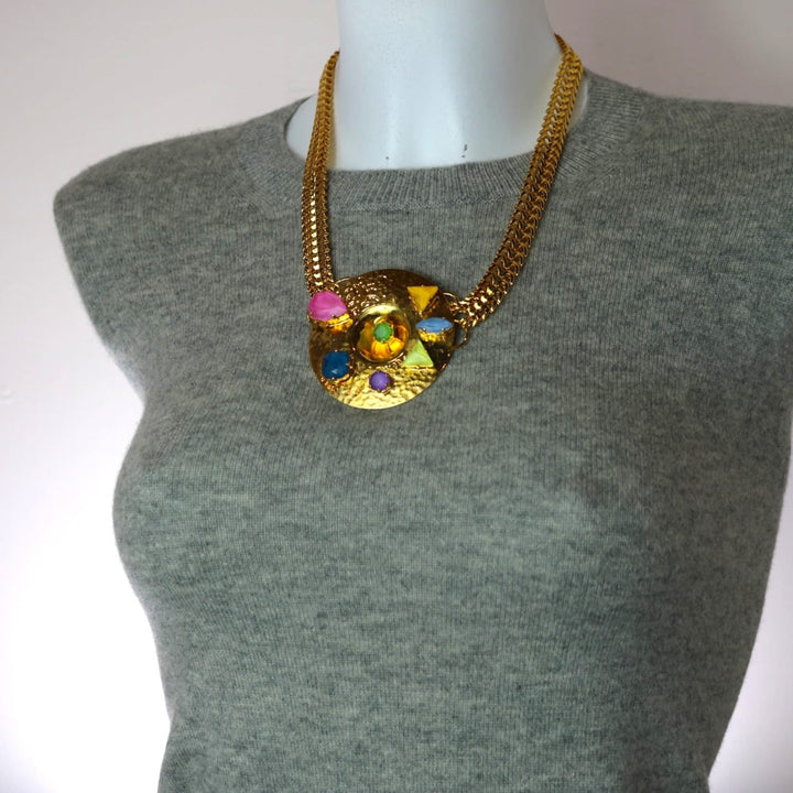 The Big Gold Necklace by Vickisarge is a statement piece inspired by a painter's palette. This necklace features hand-finished crystals scattered across a hammered centerpiece. It is finished with 23-karat gold plating, bringing color and light to any outfit. Each piece is a limited edition and comes with a certificate of authenticity.