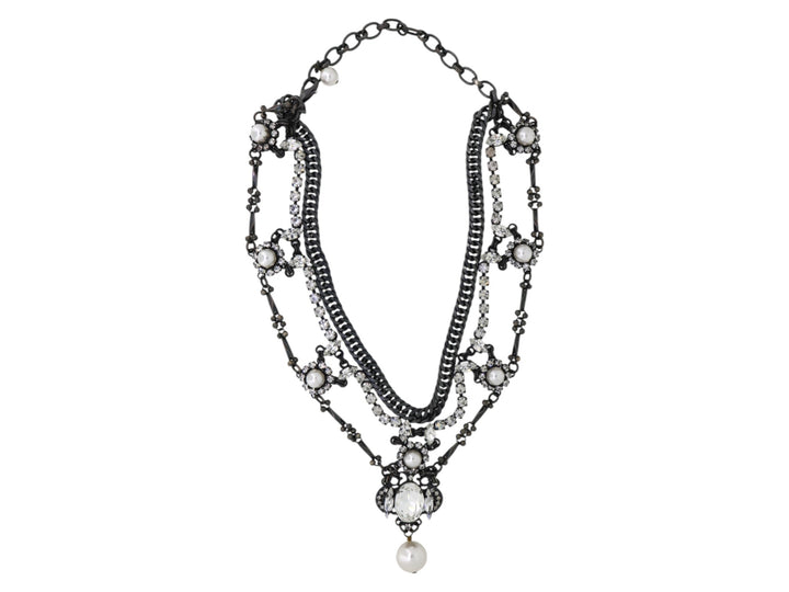 The Great Villiers Necklace by Vickisarge is a grand and one-of-a-kind statement necklace. It features a bold, modern chain layered against an ornate collar of Premium Austrian Crystals and scrollwork. The necklace is made with oxidized sterling silver plating and crystal pearls. It is handmade in a London workshop and comes with a certificate of authenticity.