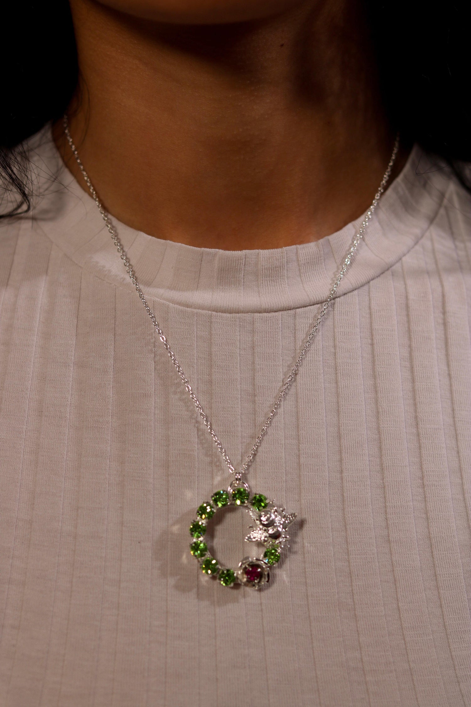 This pendant necklace is made of sterling silver-plated, nickel-free brass. It is adorned with premium Austrian crystals and has a delicate rose and bug motif. It is a limited edition of two.