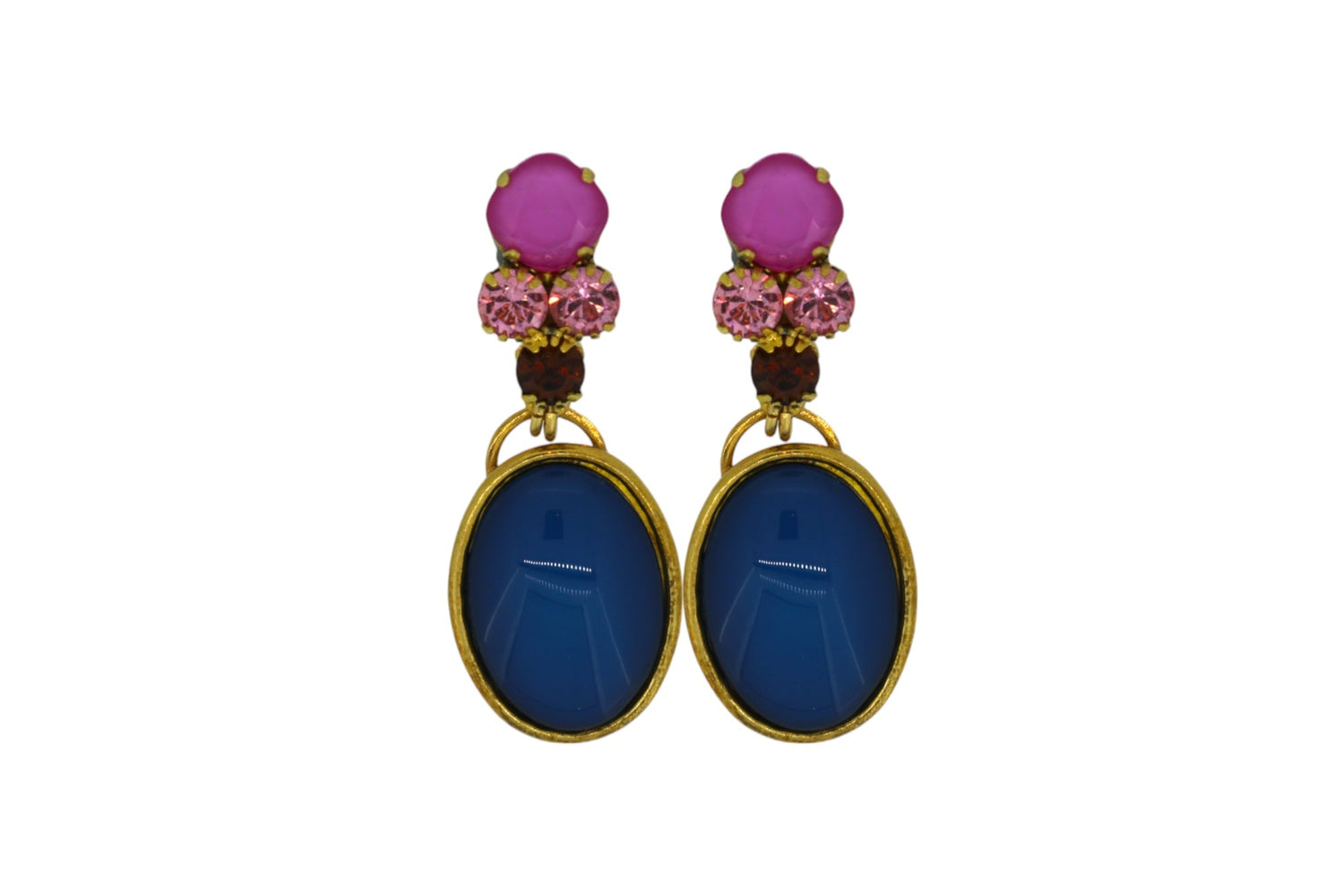 These dangle earrings are handcrafted from 23-karat gold-plated, nickel-free brass with surgical steel posts. They are set with a large crystal cabochon and other premium Austrian crystals.