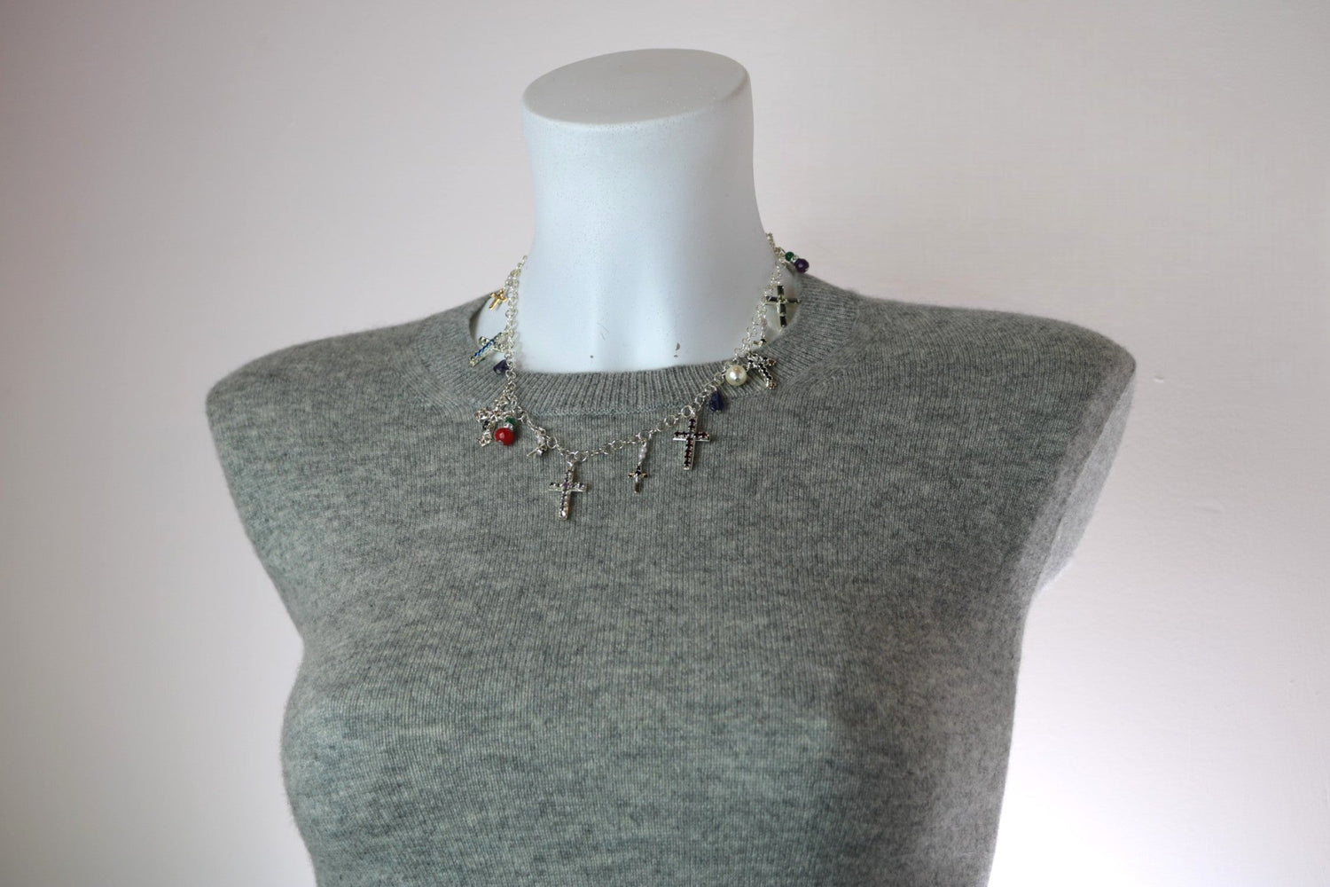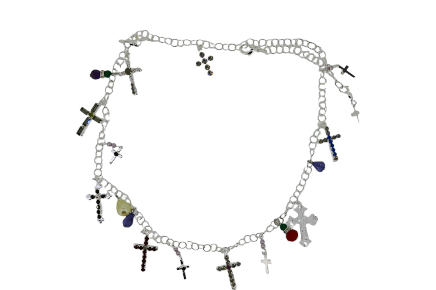 This pearl necklace is made with sterling silver-plated, nickel-free brass. It is adorned with delicate cross charms, premium Austrian crystals, and minute pearls. It is a limited edition of four.