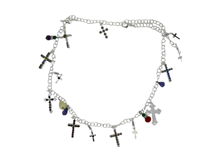 The Silver Sin Necklace by Vickisarge is a chic, limited-edition necklace. It is a silver-plated necklace adorned with an array of delicate cross charms and beads. The piece is accented with shimmering crystals and minute pearls, offering a refined, yet edgy touch. It is handmade in London and comes with a certificate of authenticity.