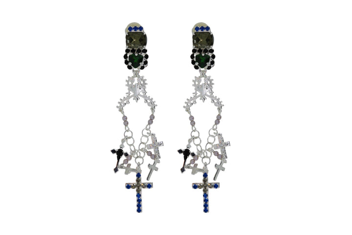These chandelier clip-on earrings are made of sterling silver-plated, nickel-free brass. They are set with premium Austrian crystals and have small cross charms. They are a limited edition of four.