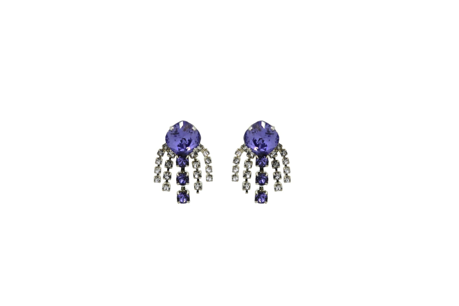 The Purple Sparkler In Platinum by Vickisarge are dazzling chandelier earrings. Handcrafted in a Kensington workshop, they feature cushion-cut crystals with shimmering tails and platinum plating. They are a subtler version of a larger style, offering a brilliant but refined display.
