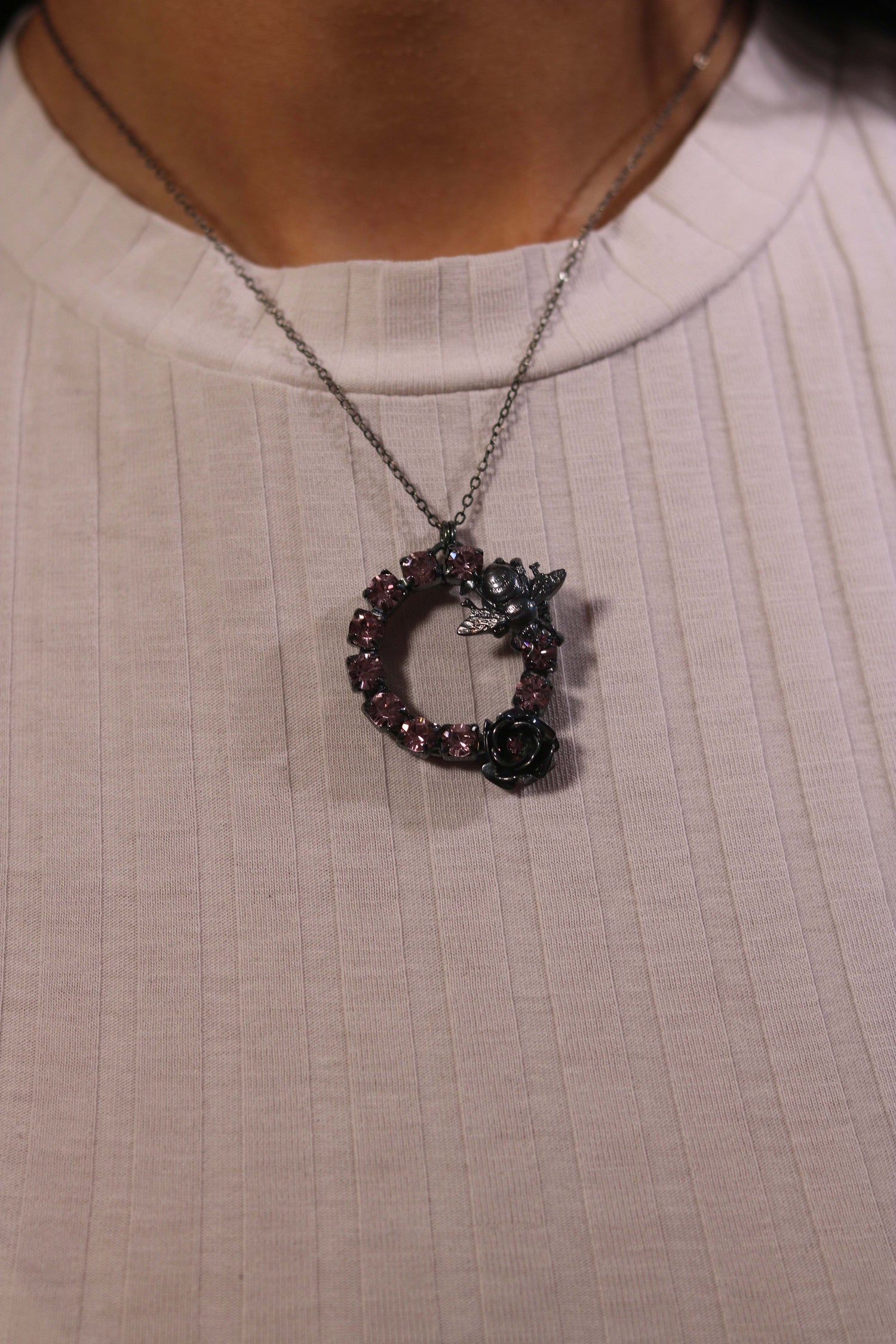 This Antiqued Circle Of Life Necklace by Vickisarge is a striking and meaningful piece. The antiqued silver-plated hoop pendant features an intricate design with delicate rose and bug motifs, both beautifully adorned with premium Austrian crystals. The crystals add a brilliant sparkle that brings the floral and insect details to life, while the circular shape symbolizes eternal love, continuity, and the cyclical nature of life. This necklace adds an enchanting and whimsical touch to any outfit.