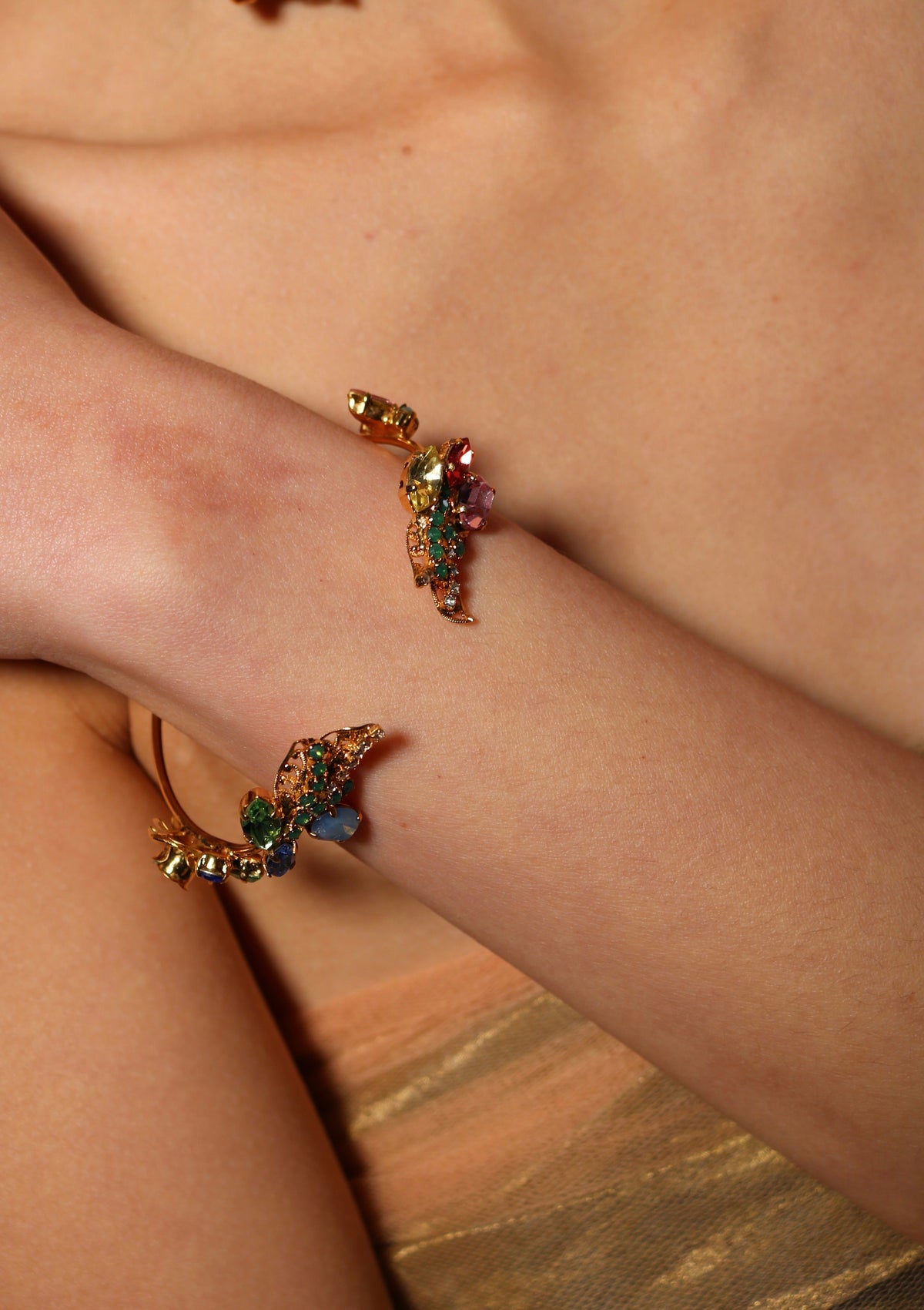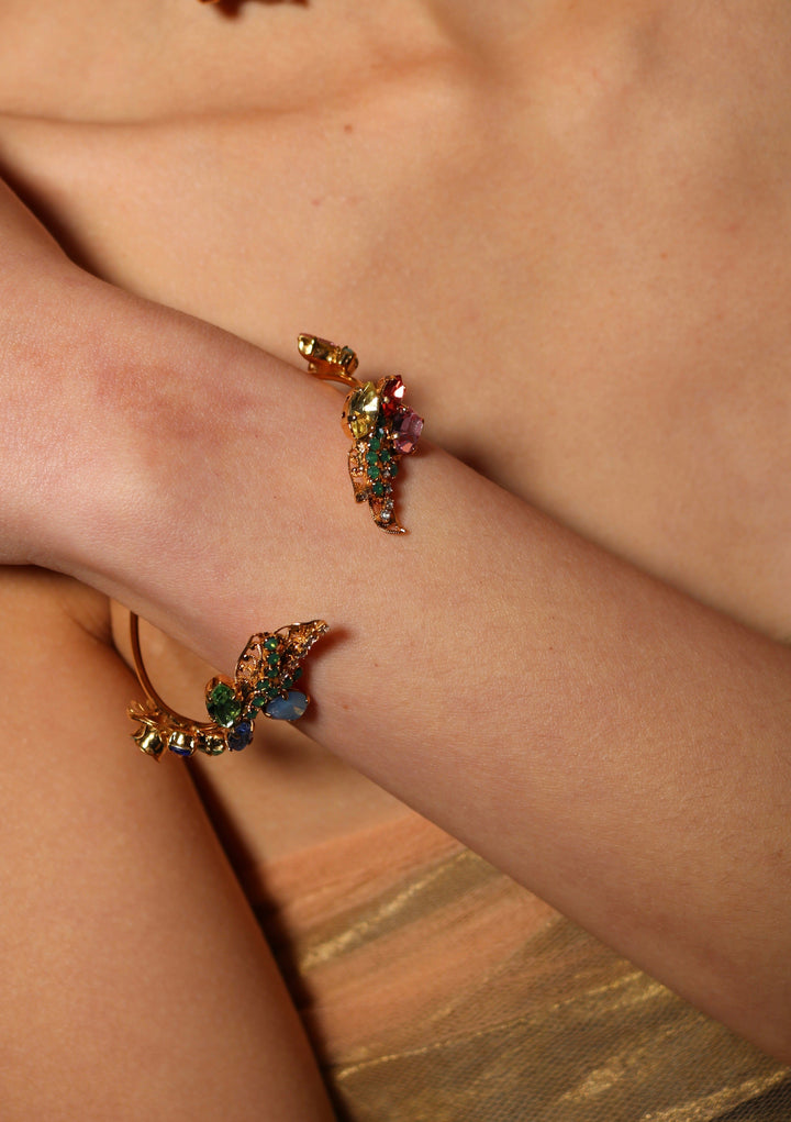 The Bloom Torque Bracelet by Vickisarge is a sculptural and elegant piece. The open-ended structure is adorned with multicoloured floral blooms, each crafted from Premium Austrian Crystal. The vibrant hues of the crystals contrast beautifully against the warm 23k Gold, creating a mesmerizing interplay of color and light. This unique bracelet is designed to gently caress the skin and make a stunning statement.