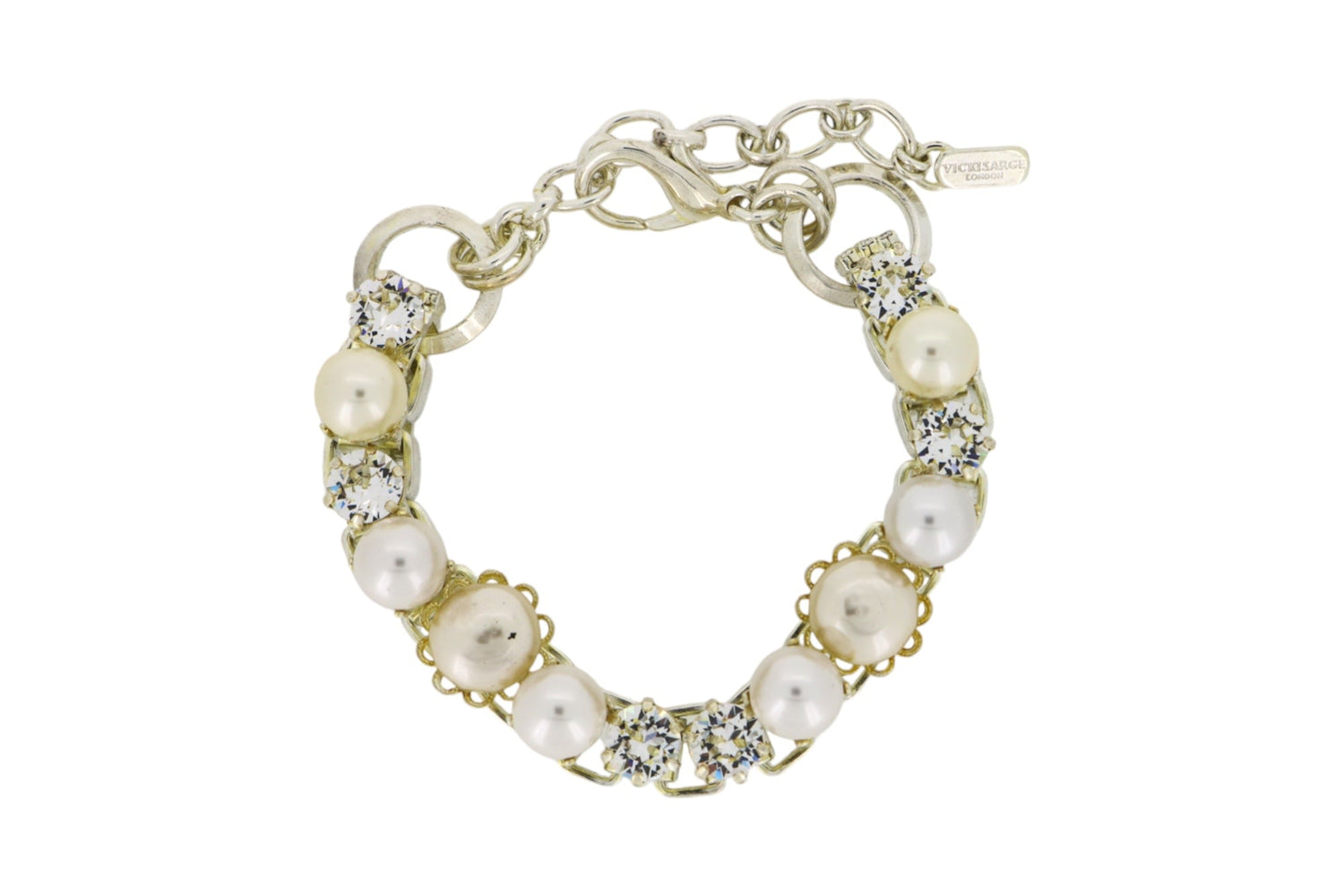 This bracelet is crafted from sterling silver-plated, nickel-free brass and features premium Austrian crystals and premium Austrian crystal pearls.