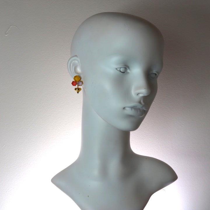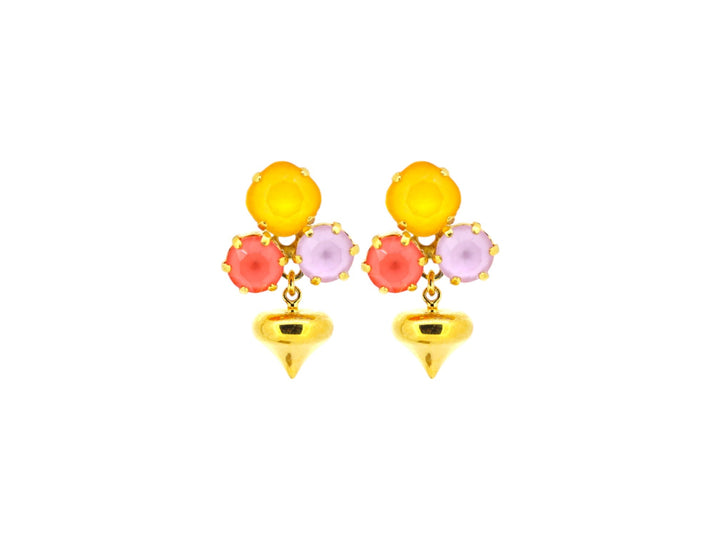 These Sweet Triangle Earrings by Vickisarge are perfect for adding a touch of color to any outfit. The earrings feature a trio of Premium Austrian Crystals in hand-finished shades of yellow, lilac, and peach, terminating in a 23k gold plated droplet. These limited-edition studs are handcrafted and are a sweet and elegant accessory.