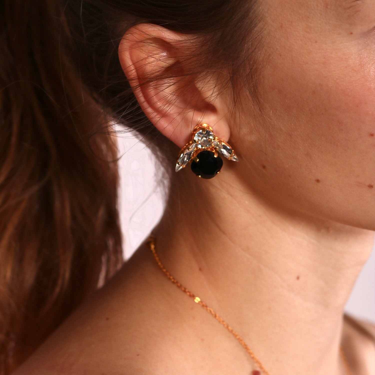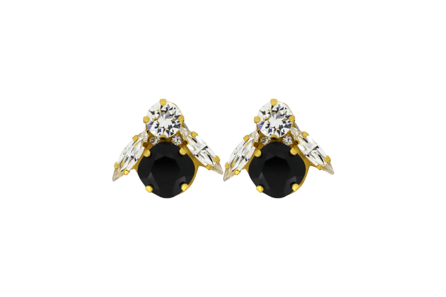 The Big Black Bee Earrings In Gold by Vickisarge are an iconic staple, dazzling and dangerous. These earrings feature dazzling cushion-cut crystals set in luxurious Gold plating. Handcrafted in the Kensington workshop, they are perfect for day or night and are a staple for every wardrobe.