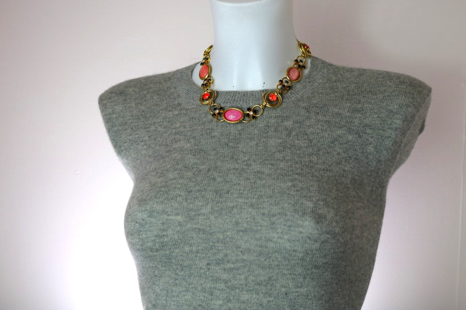 This necklace is made with S23k Gold plated Nickel-free Brass and features Premium Austrian crystals and cabochons.