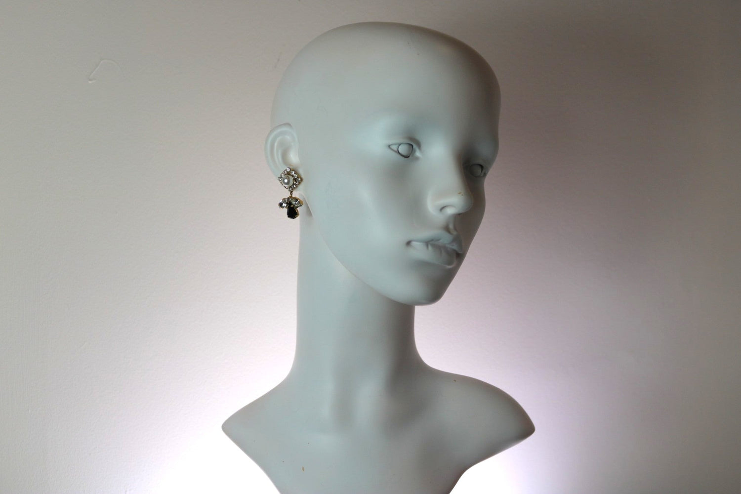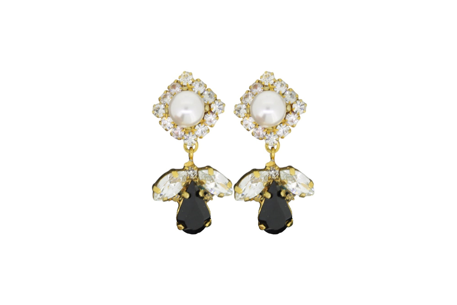 The Pearl & Crystal Dangle Earrings by Vickisarge are a timeless yet edgy piece. They feature dainty clusters of tear and marquise-cut crystals that sway from a stud of Premium Austrian Crystals with a central black stone. Handcrafted and finished in 23k Gold plated Nickel-free Brass, they are a one-of-a-kind accessory.