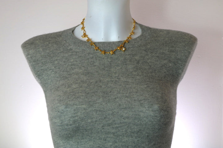 This necklace is crafted from nickel-free brass and is plated in 23k gold. It features intricate chain and filigree stars with premium Austrian crystals.