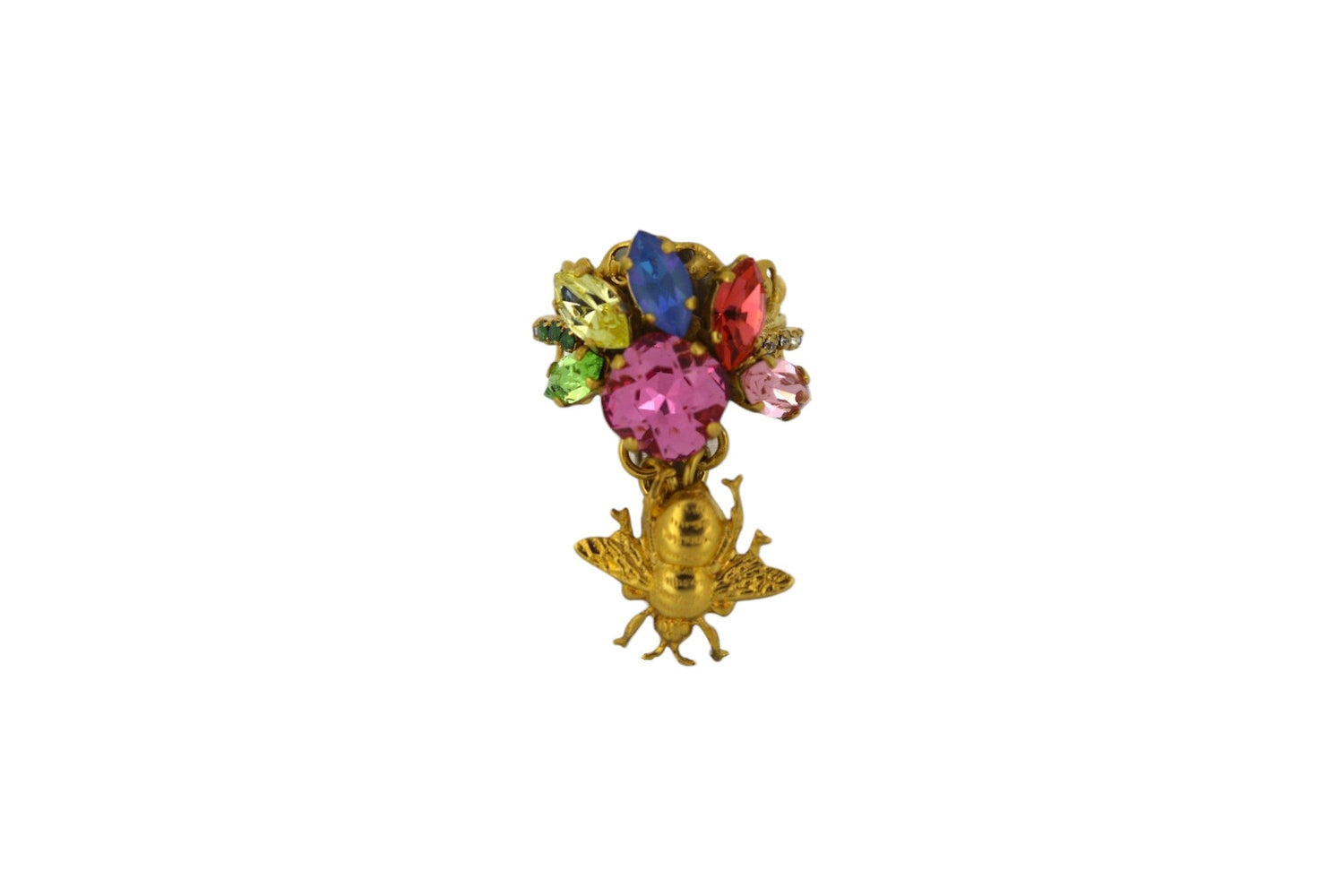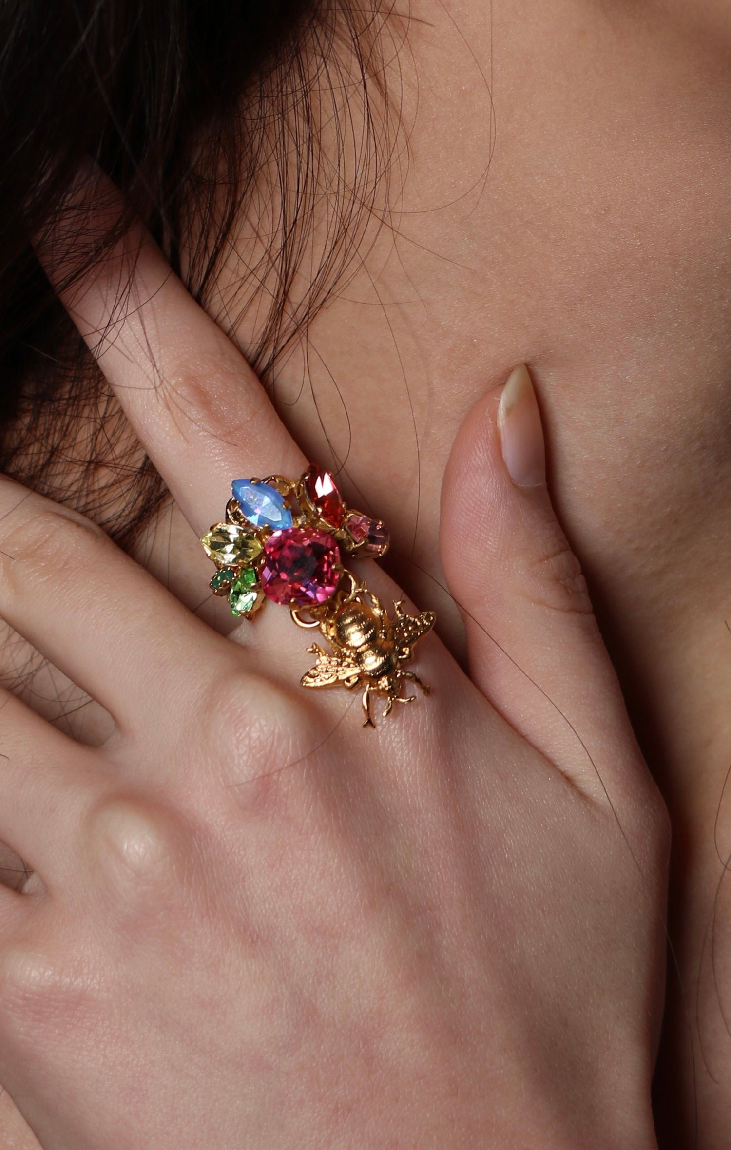 This Bouquet Ring by Vickisarge is a stunning cocktail ring that captures the vibrant beauty of a blooming garden. A brilliant array of multicolored Austrian crystals is meticulously arranged to create a harmonious and radiant design. The ring's intricate adjustable filigree band offers a perfect blend of elegance and flexible comfort, while a playful, dangling bee motif adds a whimsical and luxurious touch, celebrating the artistry of nature and fine craftsmanship.