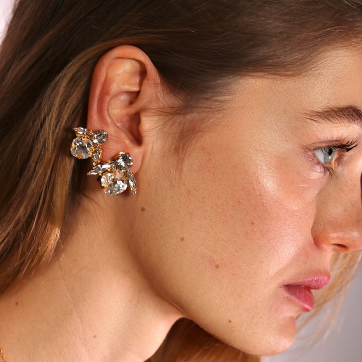 These earrings are handcrafted from 23-karat gold-plated nickel-free brass with surgical steel posts and feature premium Austrian crystals.