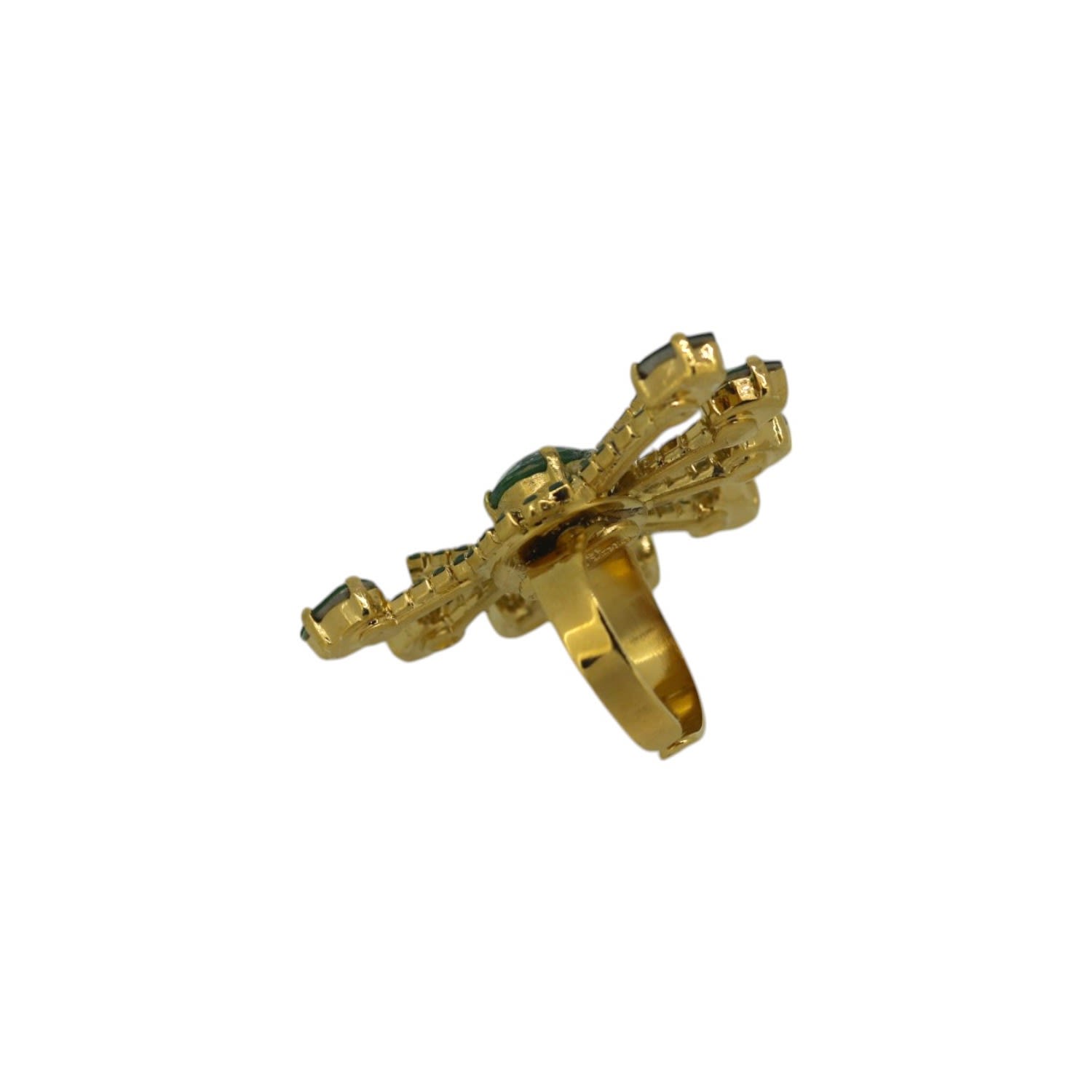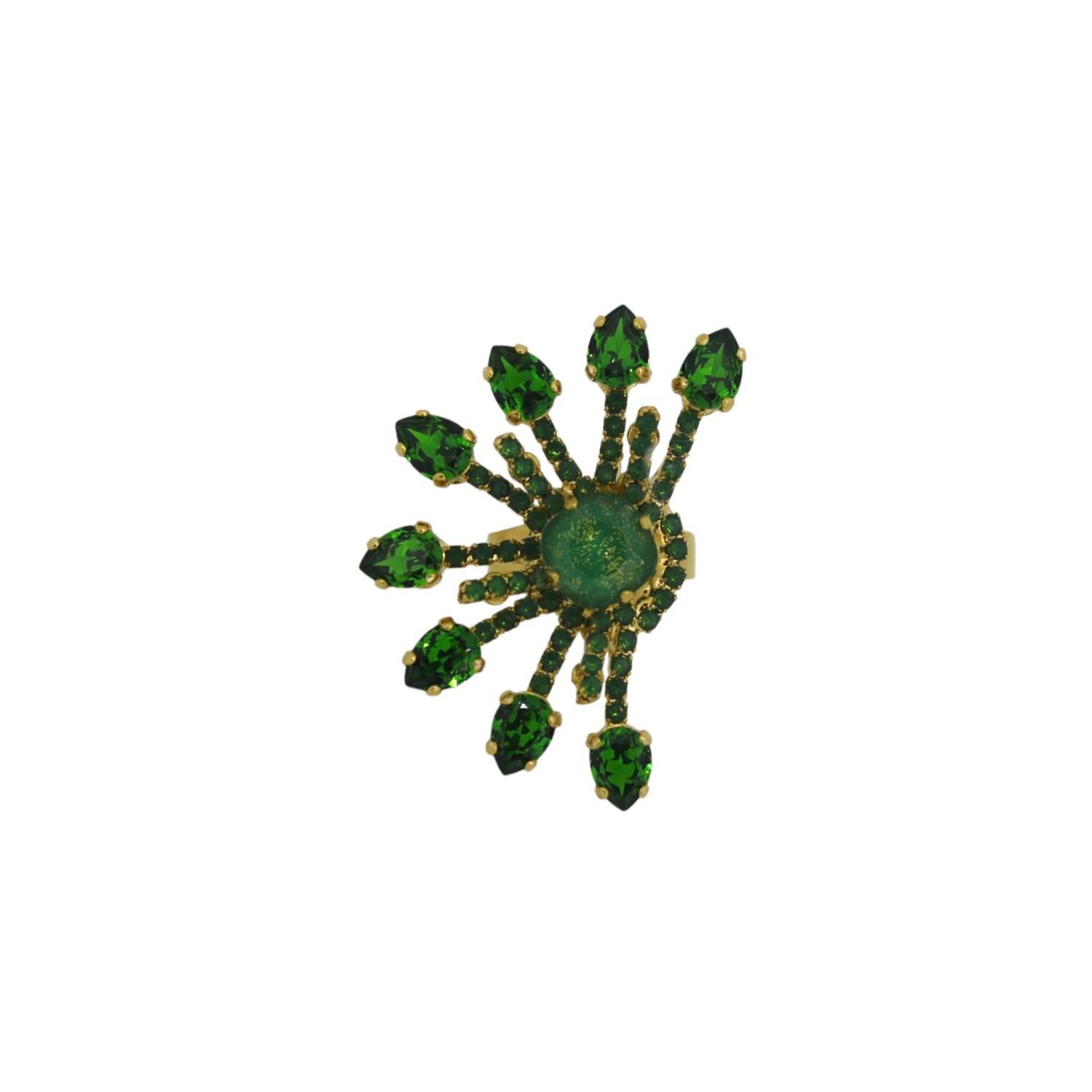 The Yuletide Green Bubbles Ring by Vickisarge is a bold and glamorous cocktail ring. This one-of-a-kind piece features a hand-finished premium Austrian crystal at its center, encircled by a semi-circular fan of radiating stones. The 23k gold-plated band ensures a luxurious and comfortable fit.