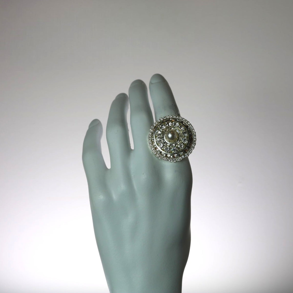 This ring is a one-of-a-kind piece handcrafted from sterling silver-plated, nickel-free brass, and set with premium Austrian crystals and pearls. It comes with a certificate of authenticity.