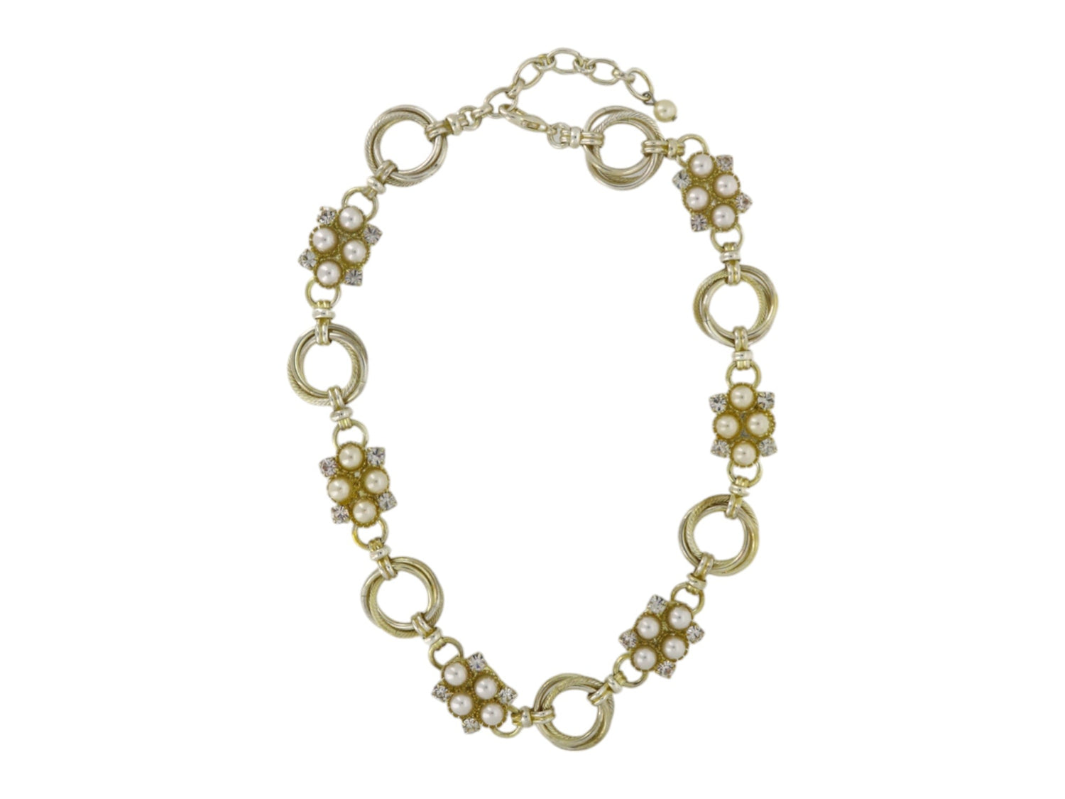 This necklace is a one-of-a-kind piece made from sterling silver-plated, nickel-free brass and is set with premium Austrian crystals and crystal pearls.