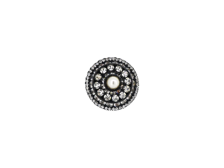 This Heavenly Dome Ring In Oxidised Silver by Vickisarge is a one-of-a-kind, opulent, and ethereal piece. The rounded, domed surface is adorned with a blend of sparkling crystals and luminous pearls. The crystals are set to catch the light from every angle, while the pearls add a soft, celestial glow, creating a heavenly look. Handmade in London, this ring is a bold and luxurious statement that is perfect for those who want to dazzle.
