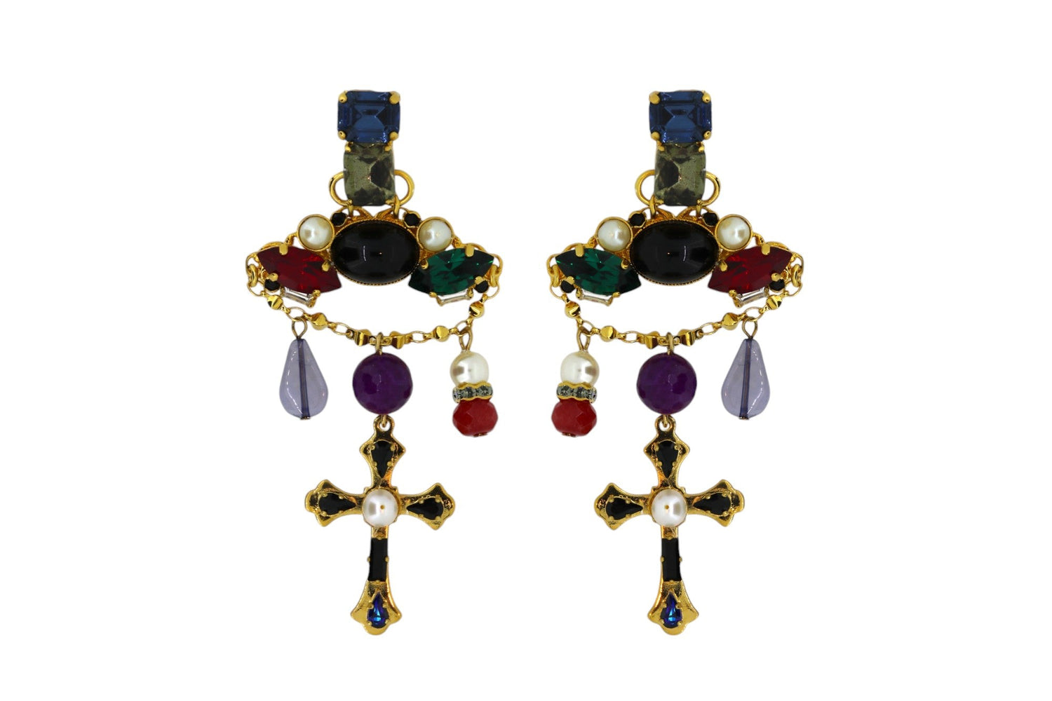 The Hanging Garland Earrings are opulent and luxurious chandelier earrings. A limited edition piece, they are embellished with vibrant jewel-toned crystals, semi-precious stones, and a dangling cross adorned with pearls and jet black stones. This dramatic accessory is perfect for making a grand statement.